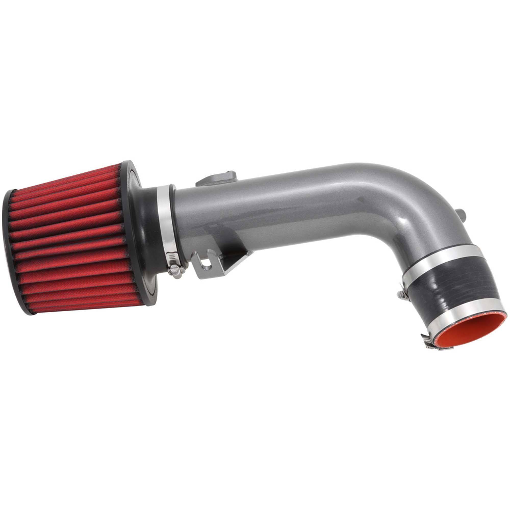 The air filter is located in the original air box space which is designed to reduce intake air temperature and increase horsepower. The intake tubing is constructed from mandrel-bent aluminum featuring a durable gunmetal gray powder coated finish. This air intake system was developed to accommodate the engine’s factory emissions control devices including the mass air flow sensor and PCV hose.