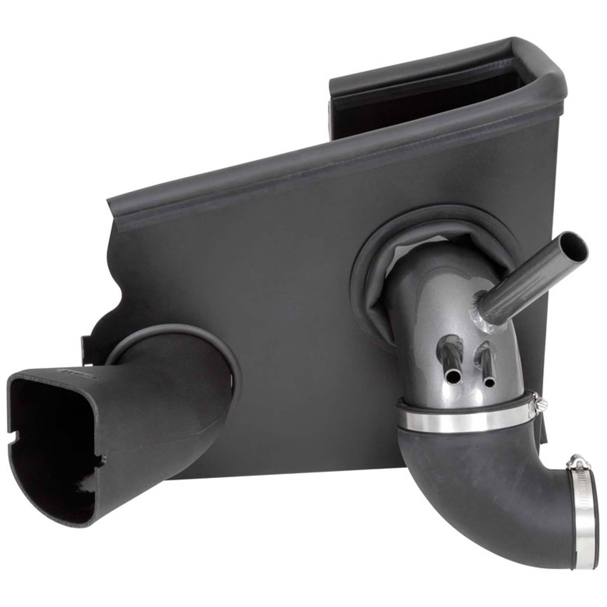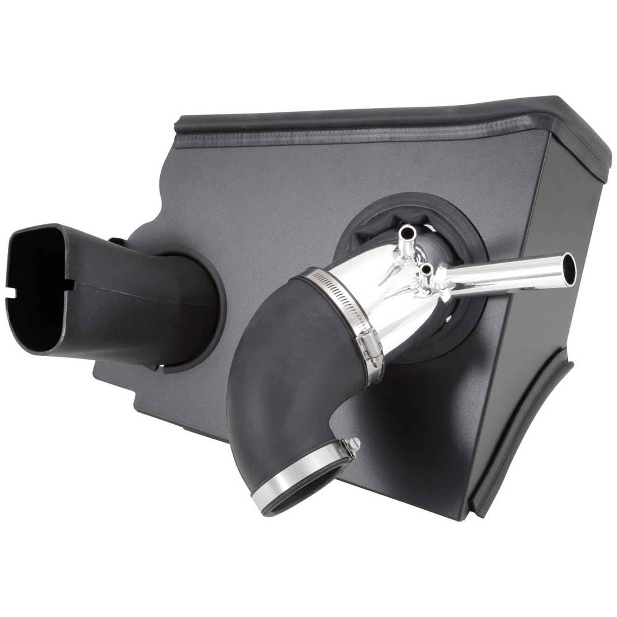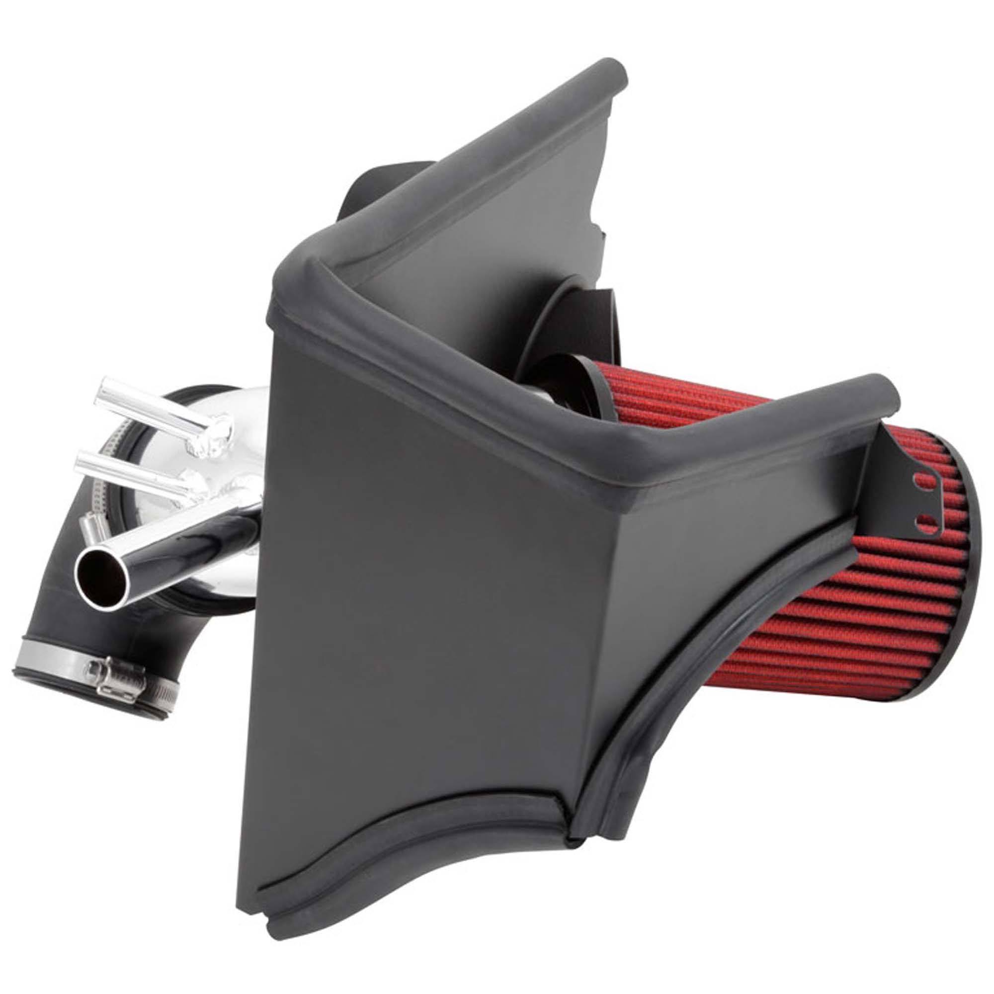 The air filter is located in the original air box space and is protected by a heat shield with a replacement air scoop adapter which is designed to reduce intake air temperature and increase horsepower. The intake tubing is constructed from mandrel-bent aluminum featuring a durable chrome-like finish. This air intake system was developed to accommodate the engine’s factory emissions control devices including the mass air flow sensor.