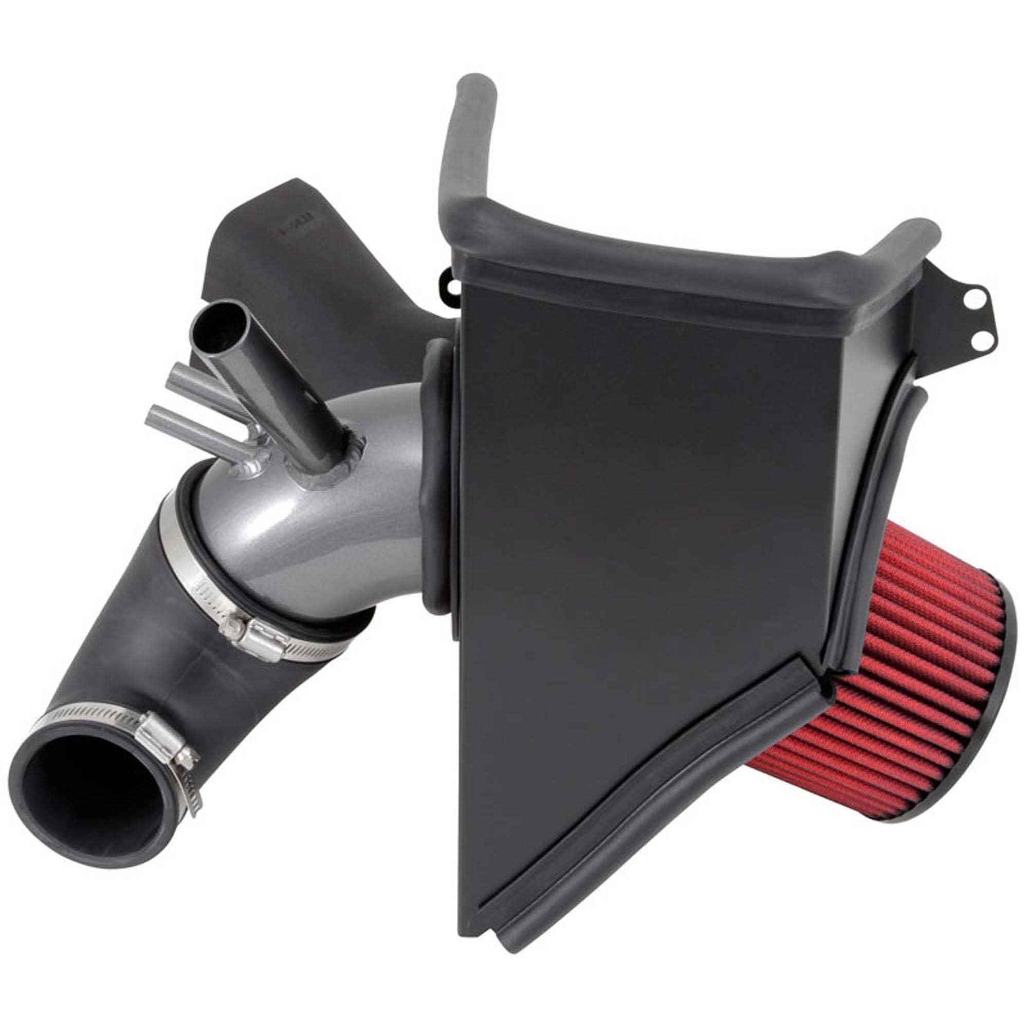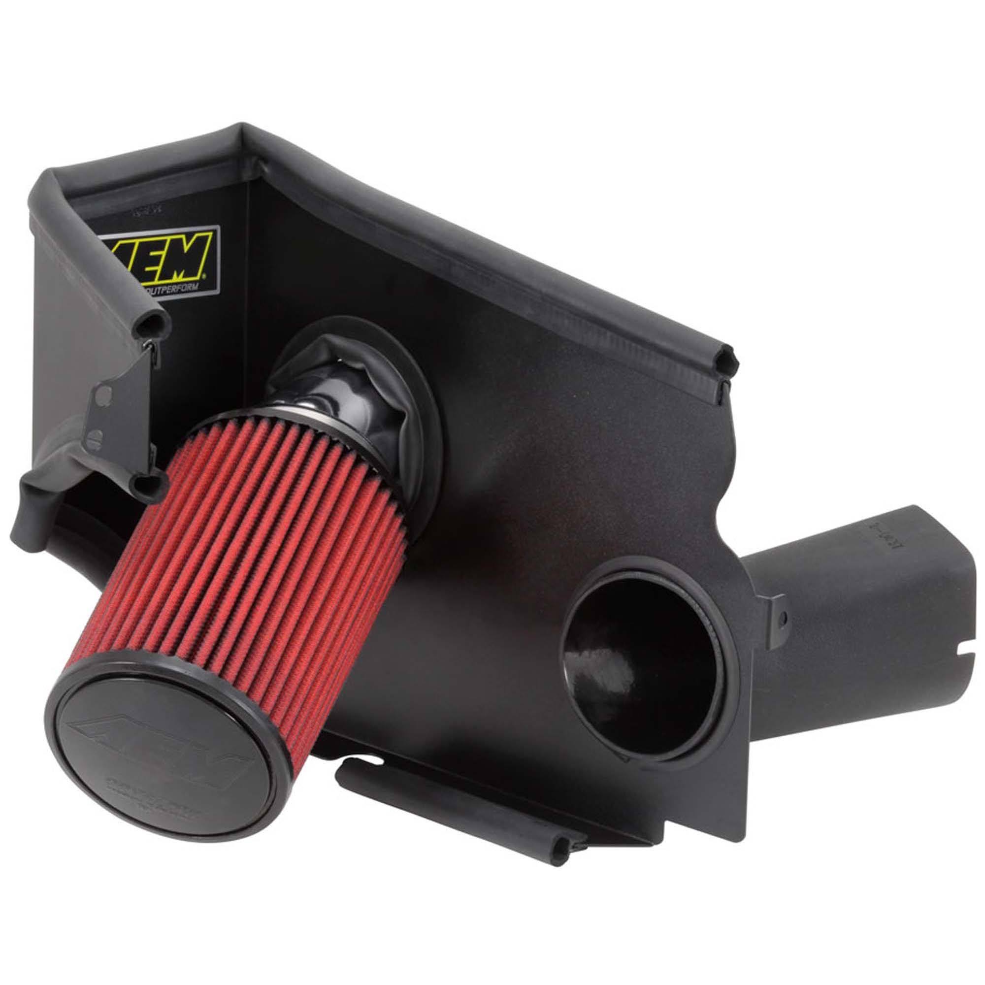 The air filter is located in the original air box space and is protected by a heat shield with a replacement air scoop adapter which is designed to reduce intake air temperature and increase horsepower. The intake tubing is constructed from mandrel-bent aluminum featuring a durable gunmetal gray powder coated finish. This air intake system was developed to accommodate the engine’s factory emissions control devices including the mass air flow sensor. The tapered cylinder shaped AEM Dryflow air filter is made from an oil-free, synthetic filter media that can be used for up to 100,000 miles before cleaning is needed (depending on driving conditions).