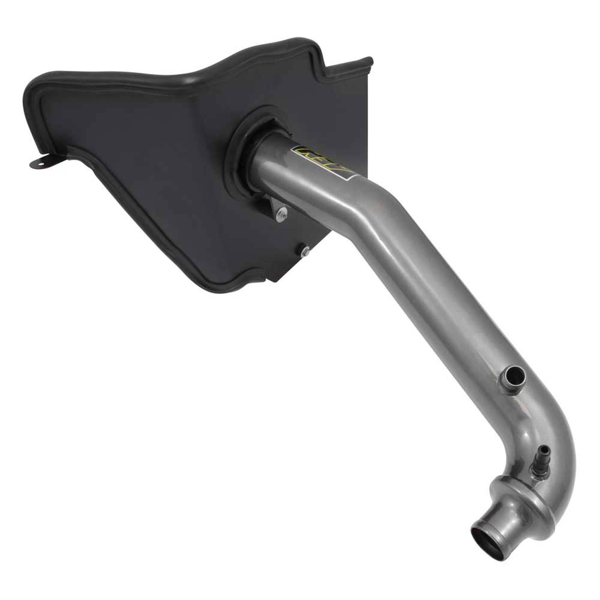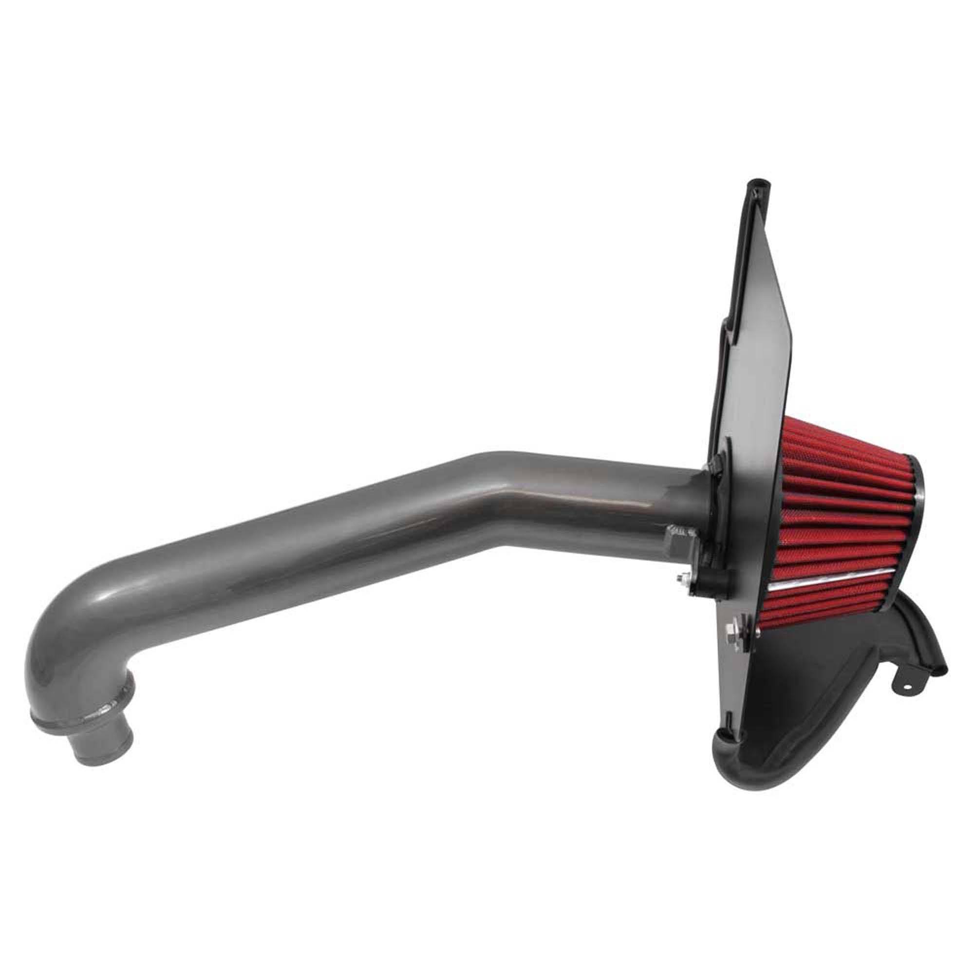 The air filter is located in the original air box space and is protected by a heat shield which is designed to reduce intake air temperature and increase horsepower. The intake tubing is constructed from mandrel-bent aluminum featuring a durable gunmetal gray powder coated finish. This air intake system was developed to accommodate the engine’s factory emissions control devices including the IAT sensor and PCV hose.