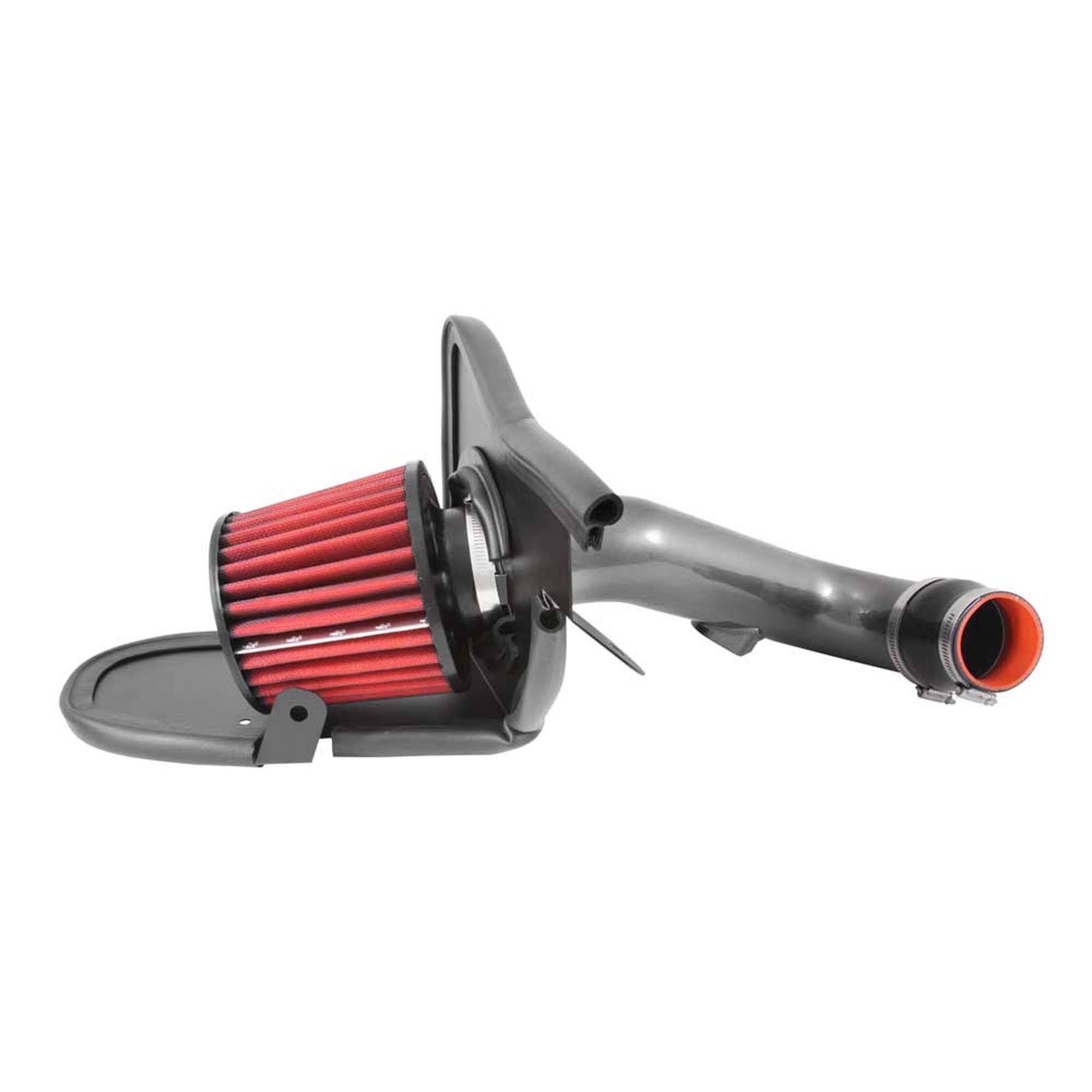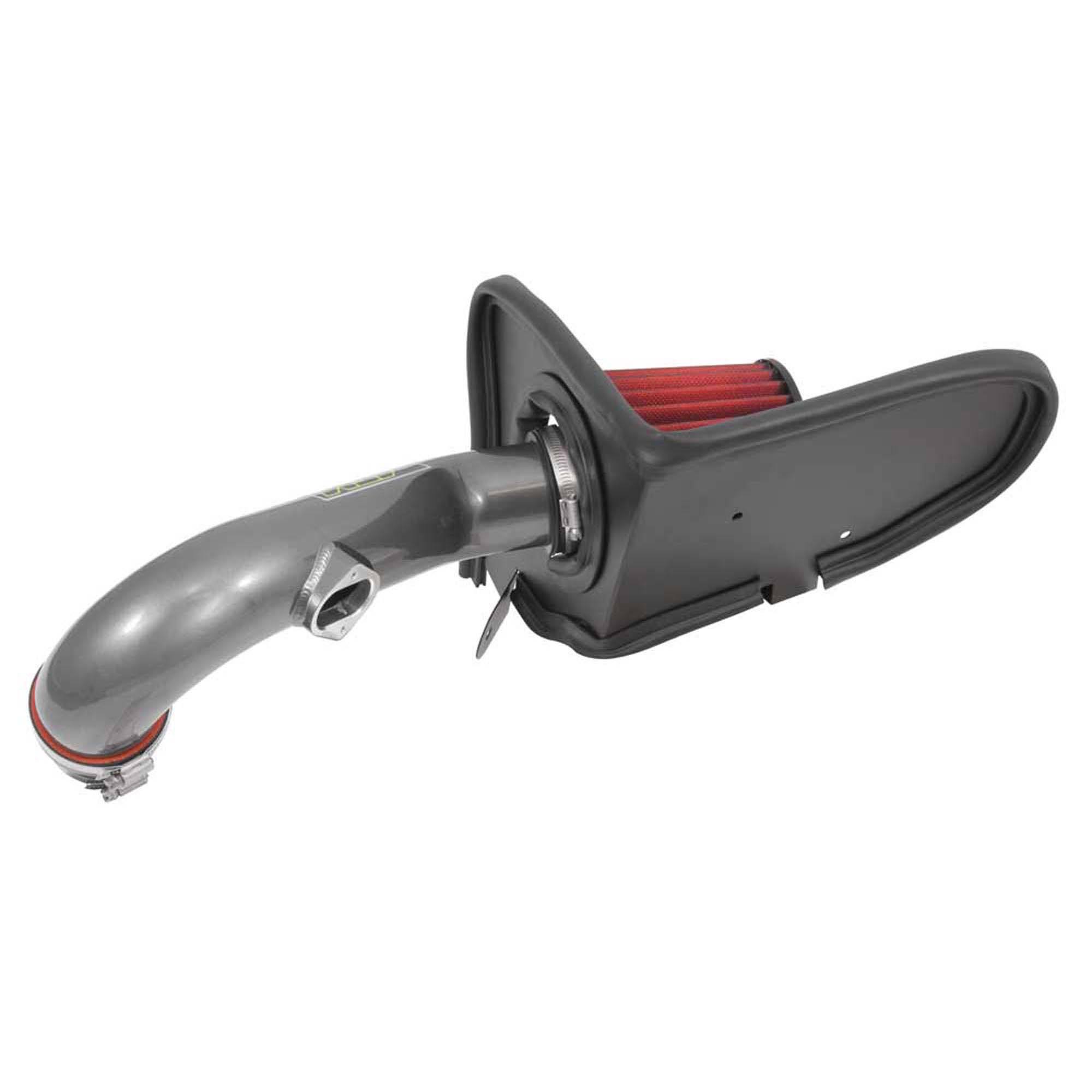 The air filter is located in the original air box space and is protected by a heat shield which is designed to reduce intake air temperature and increase horsepower. The air intake tubing is constructed from mandrel-bent aluminum featuring a durable gunmetal gray powder coated finish. This air intake system was developed to accommodate the engine’s factory emissions control devices including the mass air sensor.
