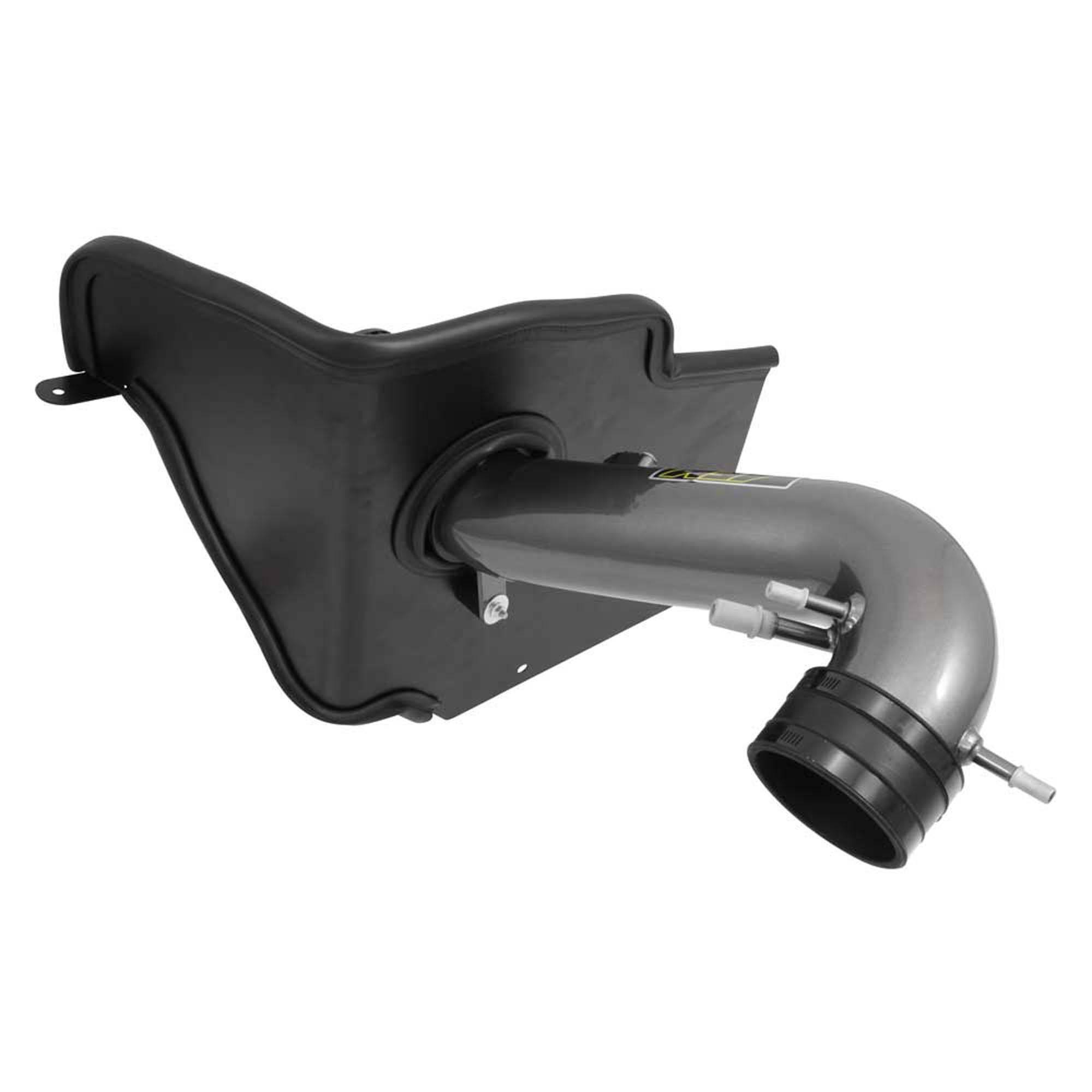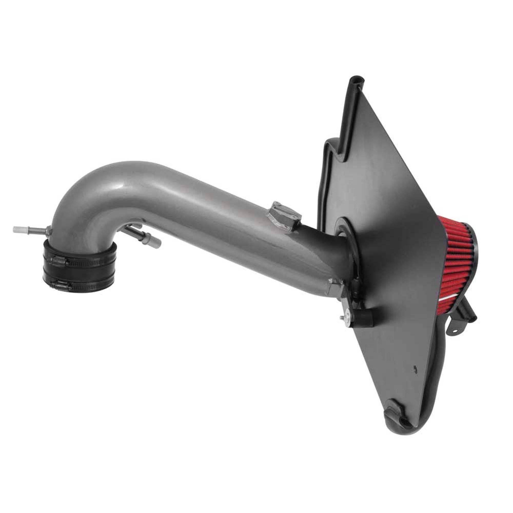 The air filter is located in the original air box space and is protected by a heat shield which is designed to reduce intake air temperature and increase horsepower. The intake tubing is constructed from mandrel-bent aluminum featuring a durable gunmetal gray powder coated finish. This air intake system was developed to accommodate the engine’s factory emissions control devices including the mass air flow sensor and vacuum/breather tubes.