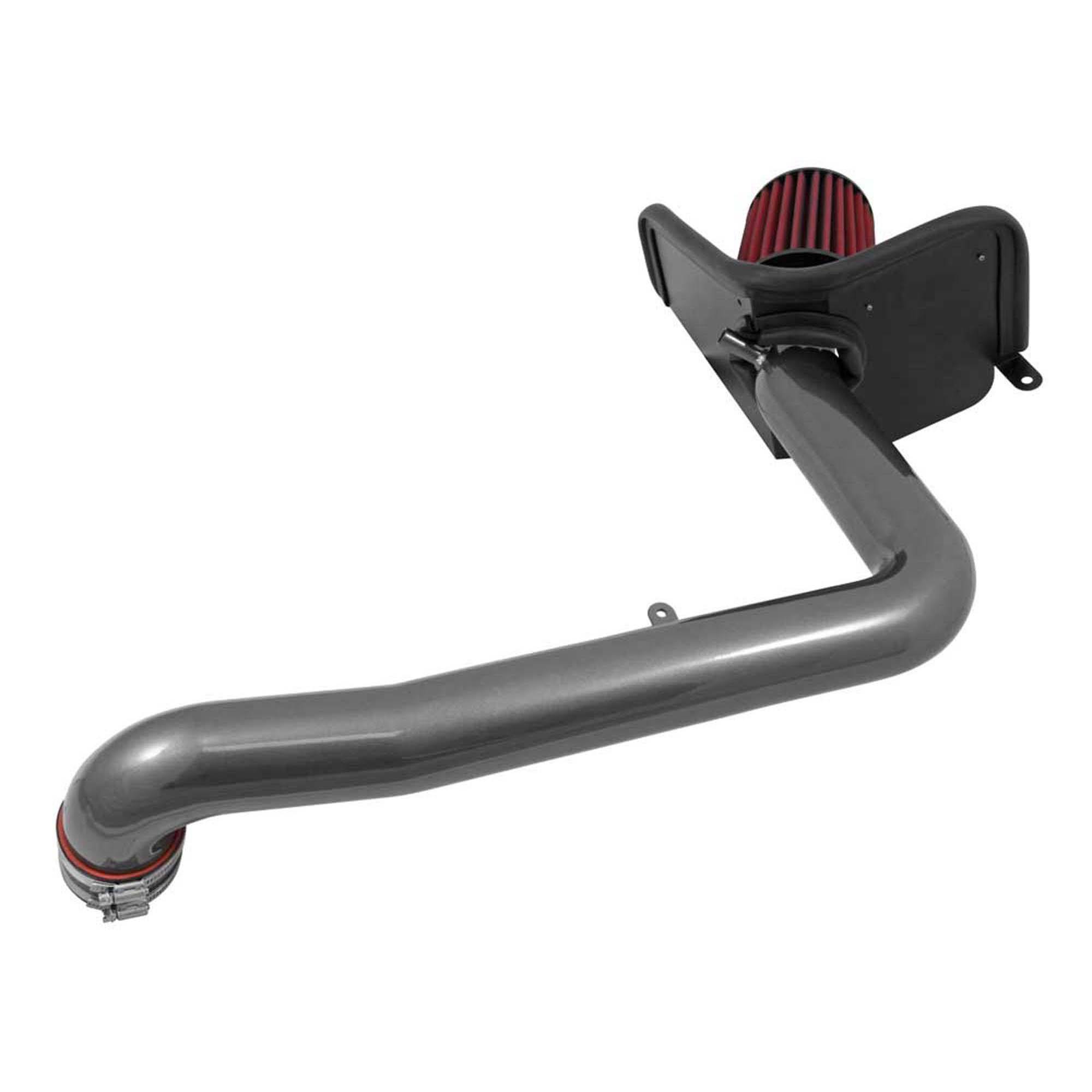 The air filter is located in the original air box space and is protected by a heat shield which is designed to reduce intake air temperature and increase horsepower. The intake tubing is constructed from mandrel-bent aluminum featuring a durable gunmetal gray powder coated finish. This air intake system was developed to accommodate the engine’s factory emissions control devices including the inlet air temperature sensor and vent hose.