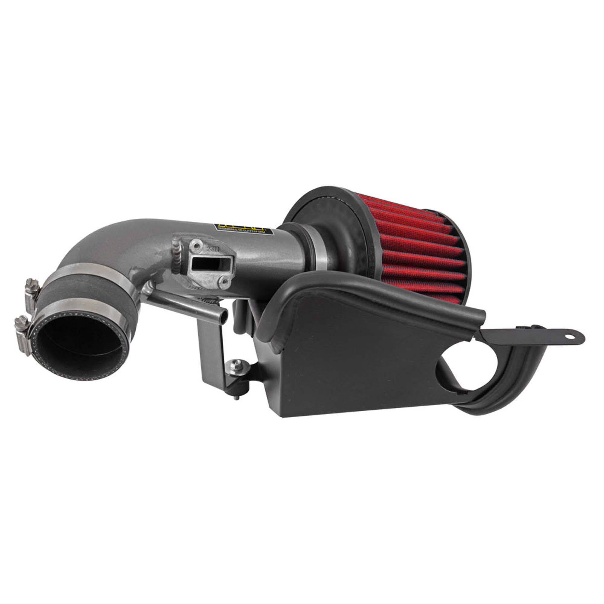 The air filter is located in the original air box space and is protected by a heat shield which is designed to reduce intake air temperature and increase horsepower. The air intake tube is constructed from mandrel-bent aluminum featuring a durable gunmetal gray powder coated finish. This air intake system was developed to accommodate the engine’s factory emissions control devices including the mass air sensor and engine vent tube.