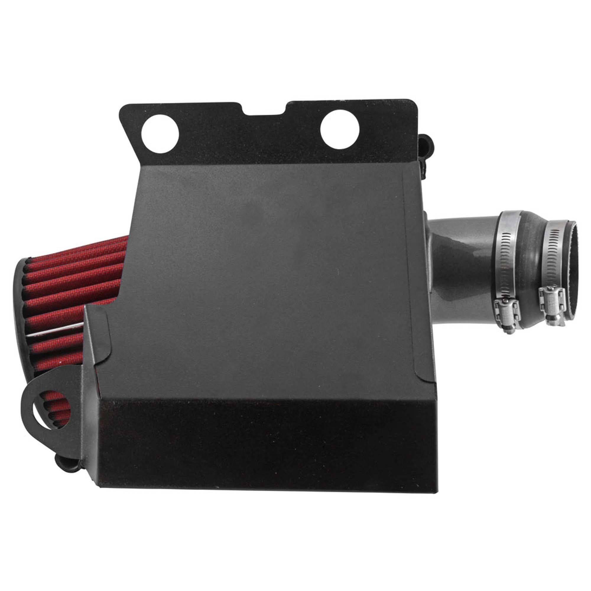 The air filter is located in the original air box space and is protected by a heat shield which is designed to reduce intake air temperature and increase horsepower. The air intake tube is constructed from mandrel-bent aluminum featuring a durable gunmetal gray powder coated finish. This air intake system was developed to accommodate the engine’s factory emissions control devices including the mass airflow sensor and breather tube.