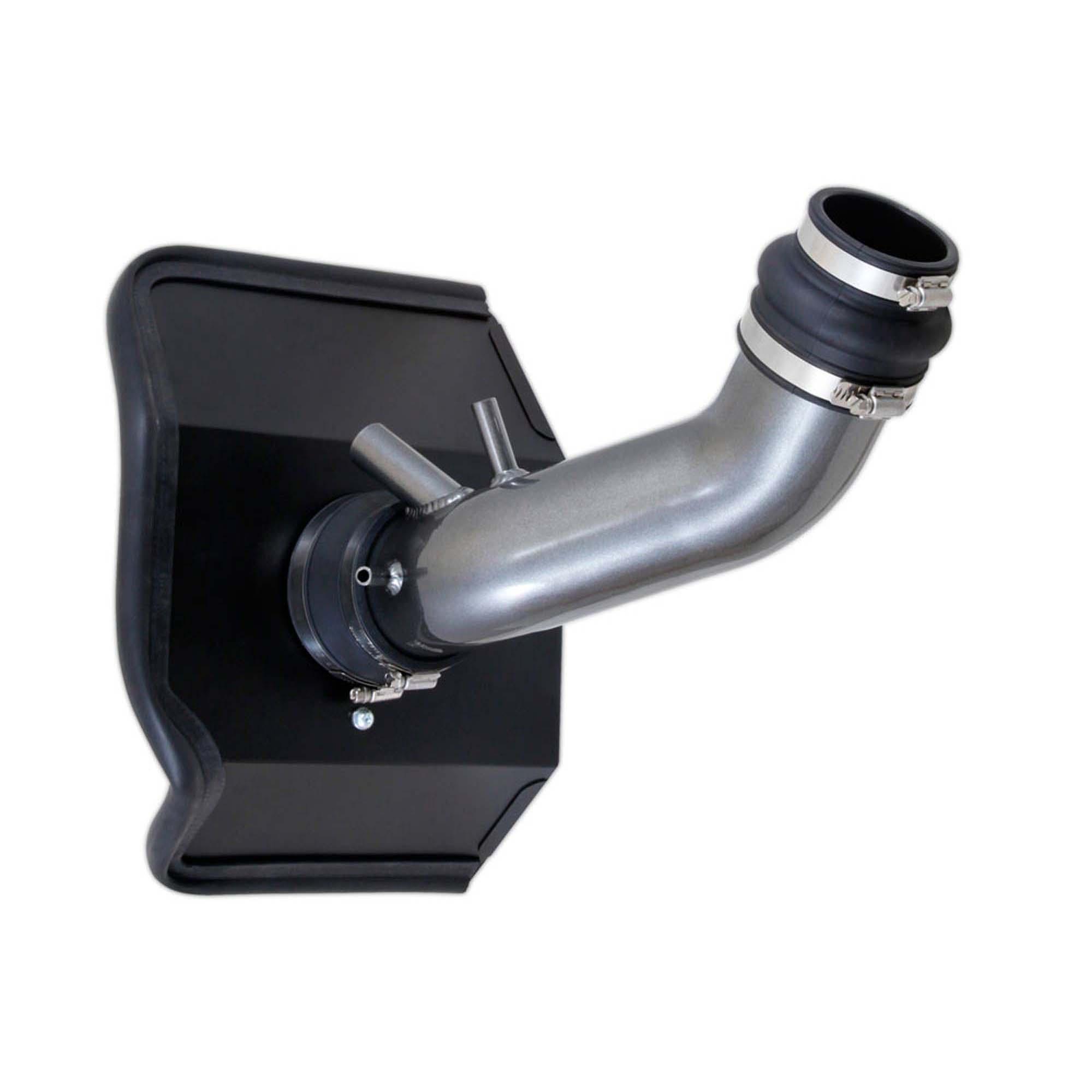 The air filter is located in the original air box space and is protected by a heat shield which is designed to reduce intake air temperature and increase horsepower. The air intake tube is constructed from mandrel-bent aluminum featuring a durable gunmetal gray powder coated finish. This air intake system was developed to accommodate the engine’s factory emissions control devices including the EVAP and other vent lines.