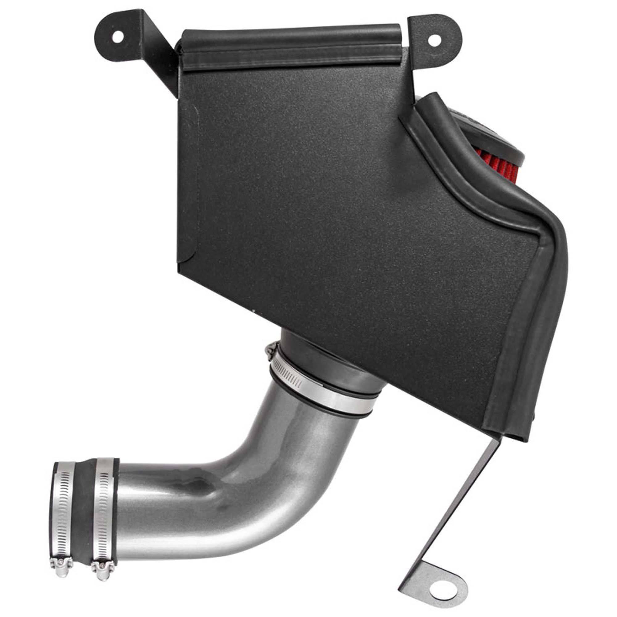 The air filter is located in the original air box location and is protected by a heat shield which is designed to reduce intake air temperature and increase horsepower. The air intake tube is constructed from mandrel-bent aluminum featuring a durable gunmetal gray powder coated finish.