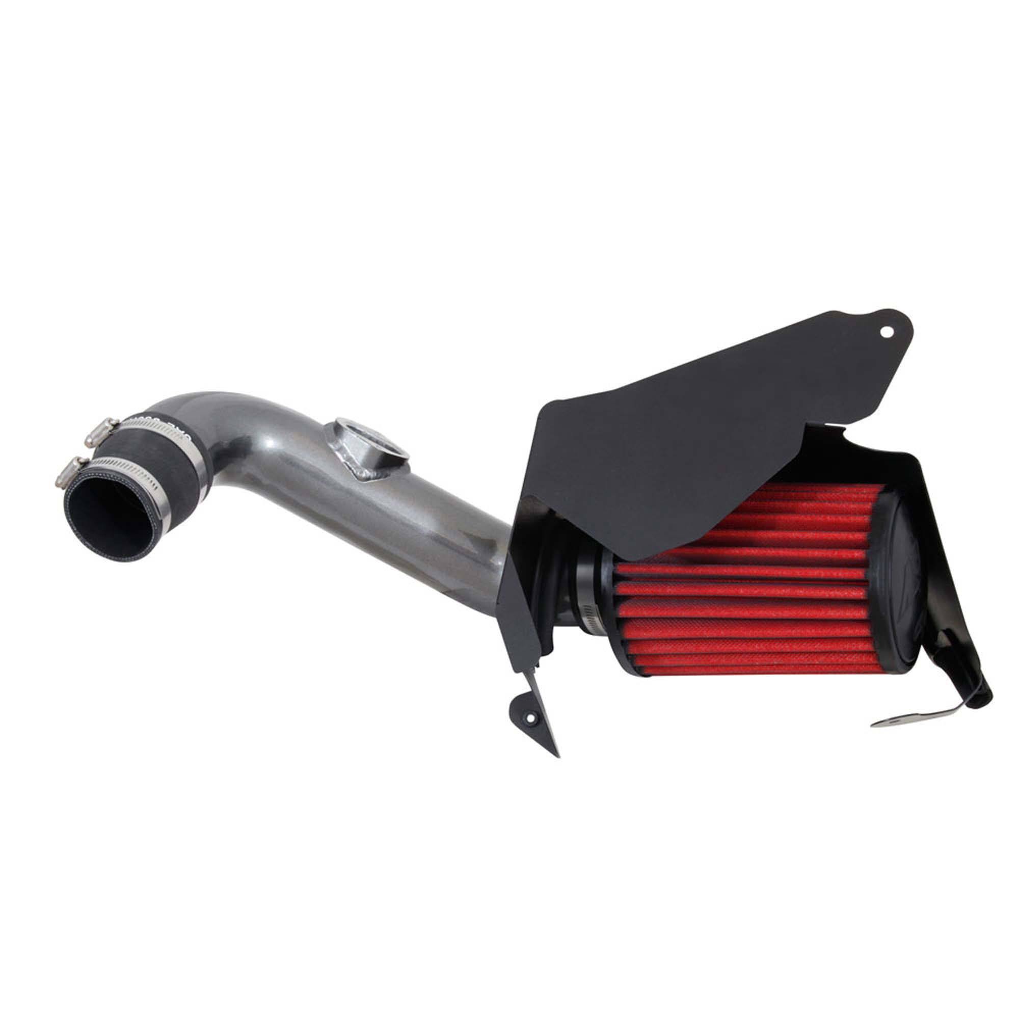 The air filter is located in the original air box space and is protected by a heat shield which is designed to reduce intake air temperature and increase horsepower. The air intake tube is constructed from mandrel-bent aluminum featuring a durable gunmetal gray powder coated finish. This air intake system was developed to accommodate the engine’s factory emissions control devices including the mass air sensor.