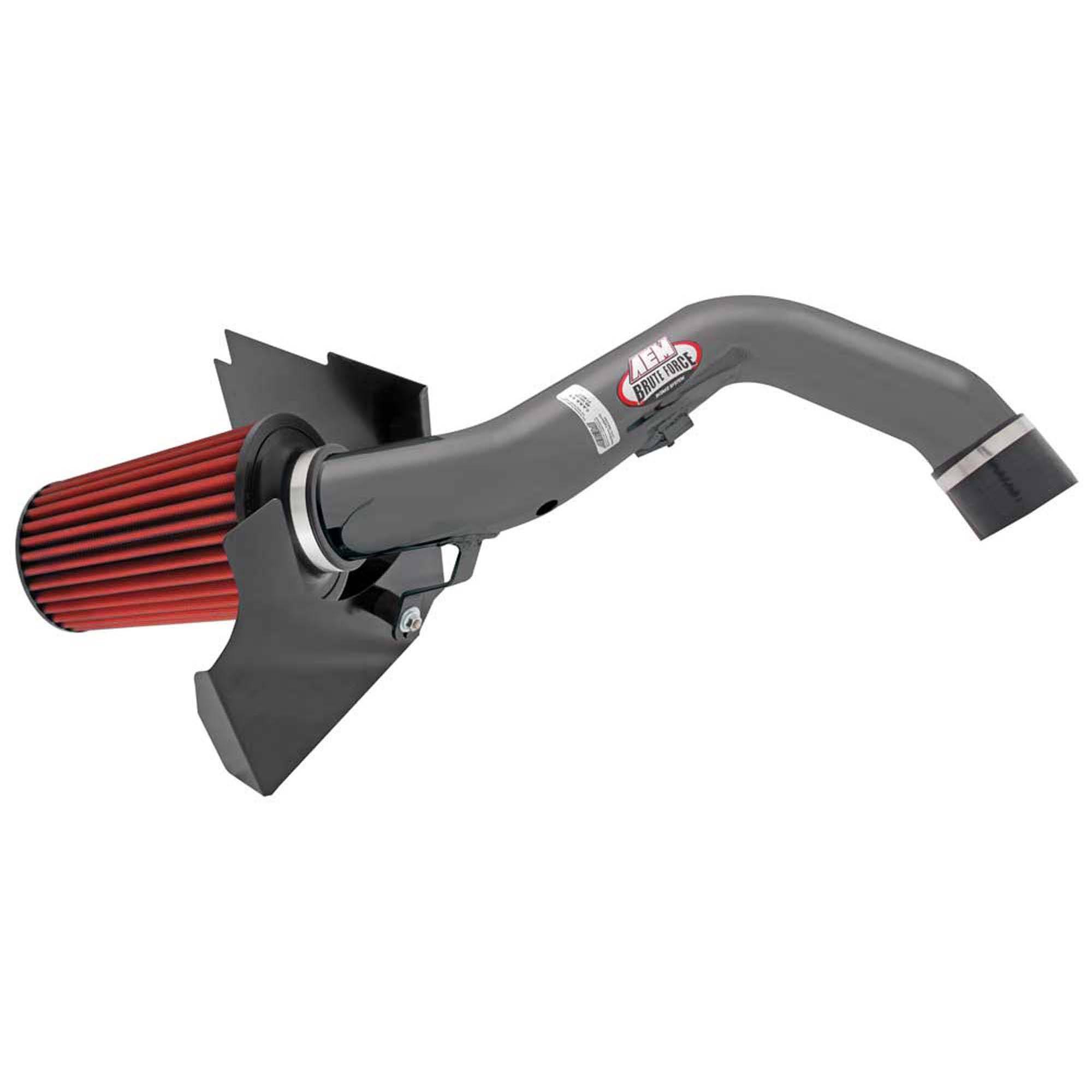 The intake tubing is constructed from mandrel-bent aluminum featuring a durable gunmetal gray powder coated finish. This air intake system was developed to accommodate the engine’s factory emissions control devices including the mass air flow sensor and air filter restriction gauge. The tapered cylinder shaped AEM Dryflow air filter is made from an oil-free, synthetic filter media that can be used for up to 100,000 miles before cleaning is needed (depending on driving conditions).