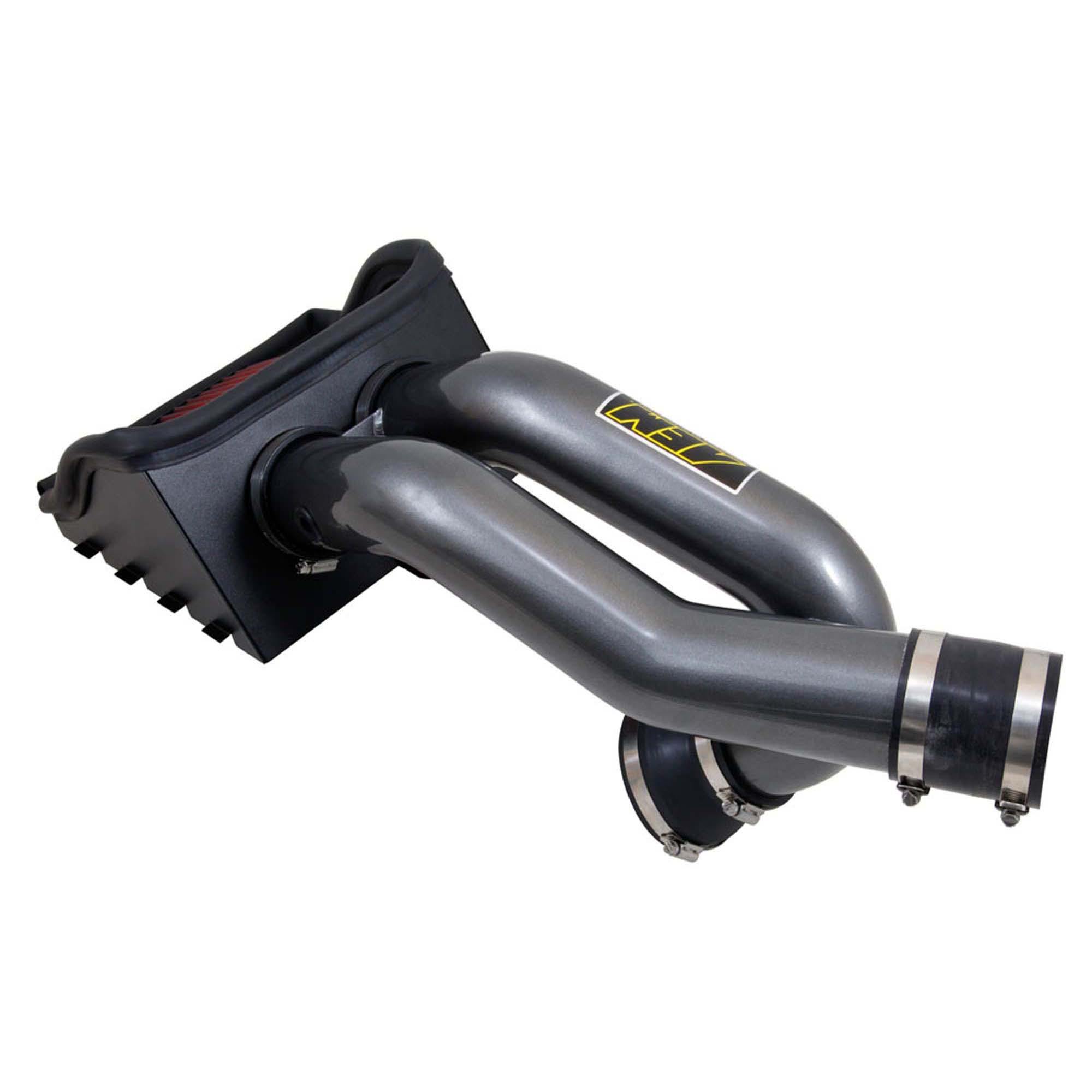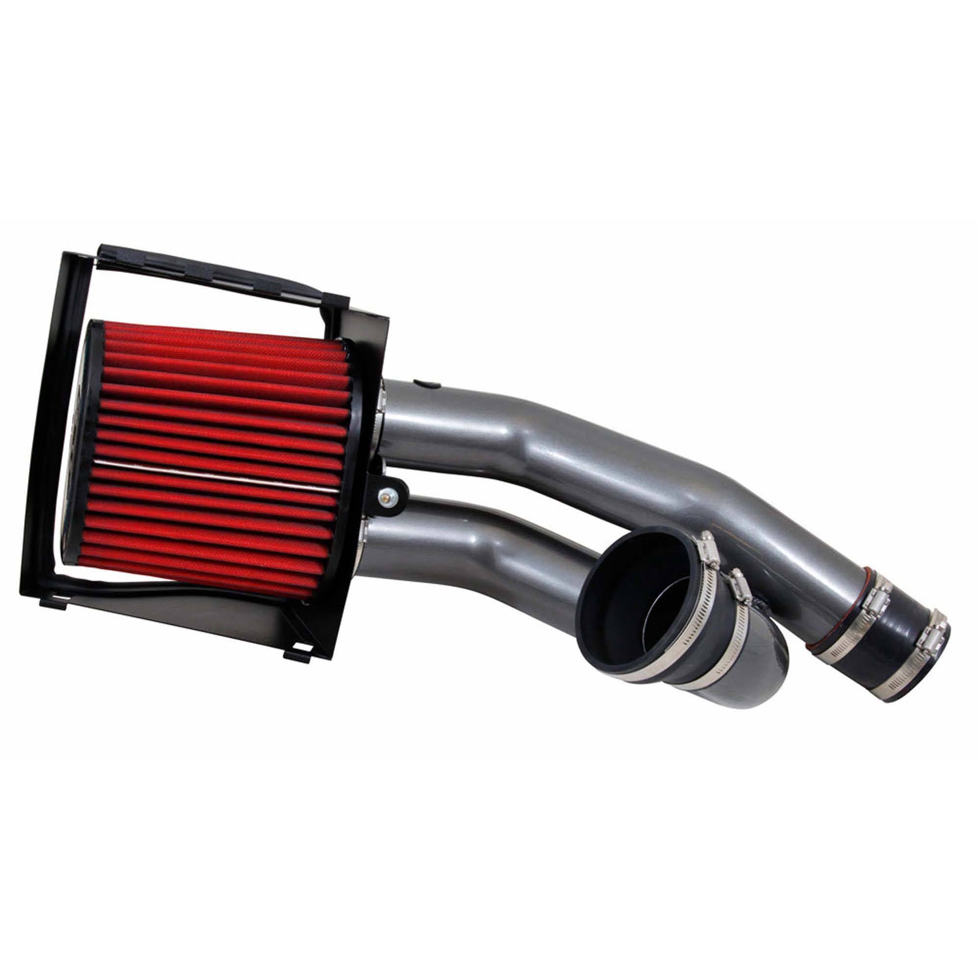 The air filter is located in the original air box space and is protected by a heat shield which is designed to reduce intake air temperature and increase horsepower. The air intake tubes are constructed from mandrel-bent aluminum featuring a durable gunmetal gray powder coated finish. This air intake system was developed to accommodate the engine’s factory emissions control devices including the intake air temperature sensor.