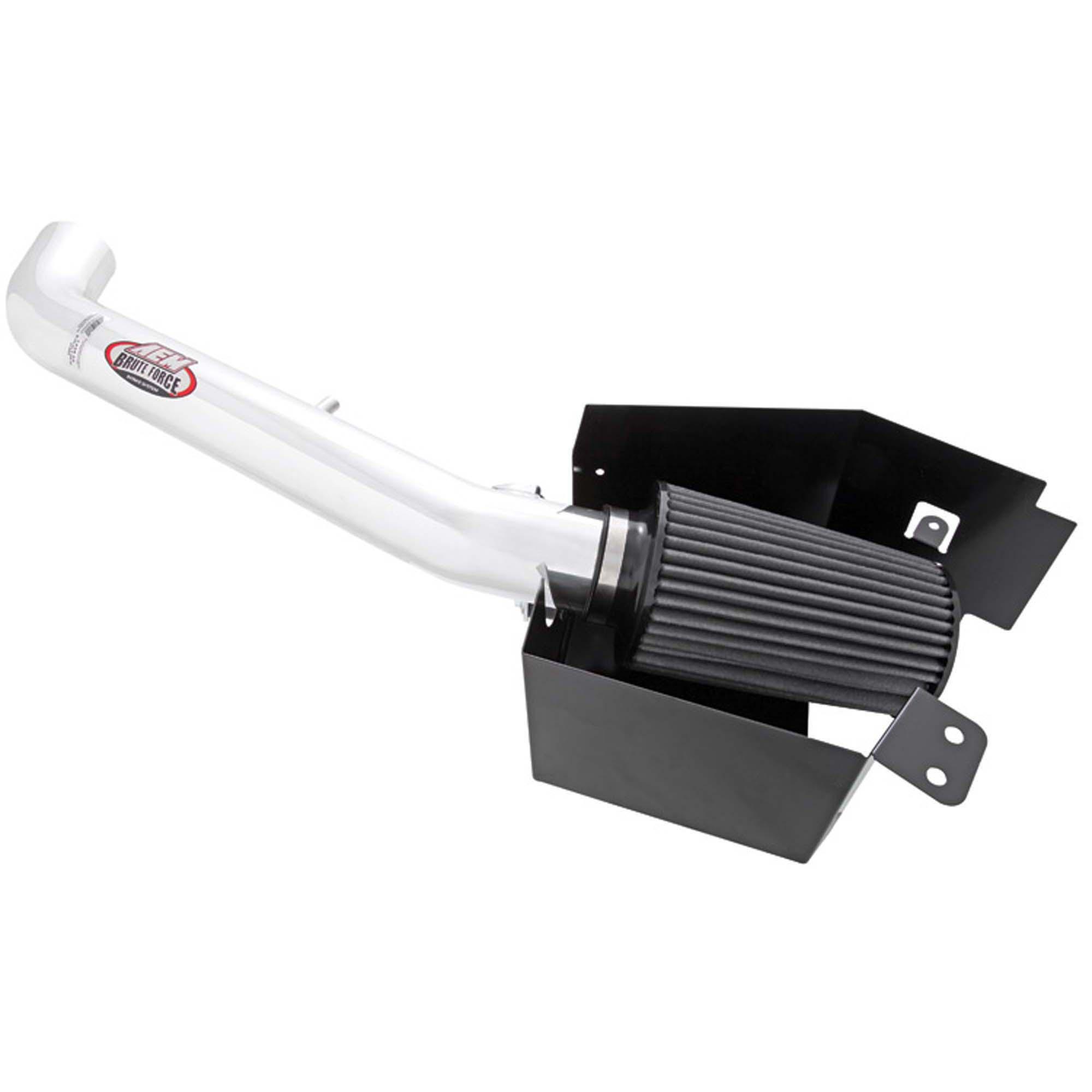The air filter is located in the original air box space and is protected by a heat shield which is designed to reduce intake air temperature and increase horsepower. The intake tubing is constructed from mandrel-bent aluminum featuring a durable chrome-like finish. This air intake system was developed to accommodate the engine’s factory emissions control devices including the mass air flow sensor and crank case vent hose.