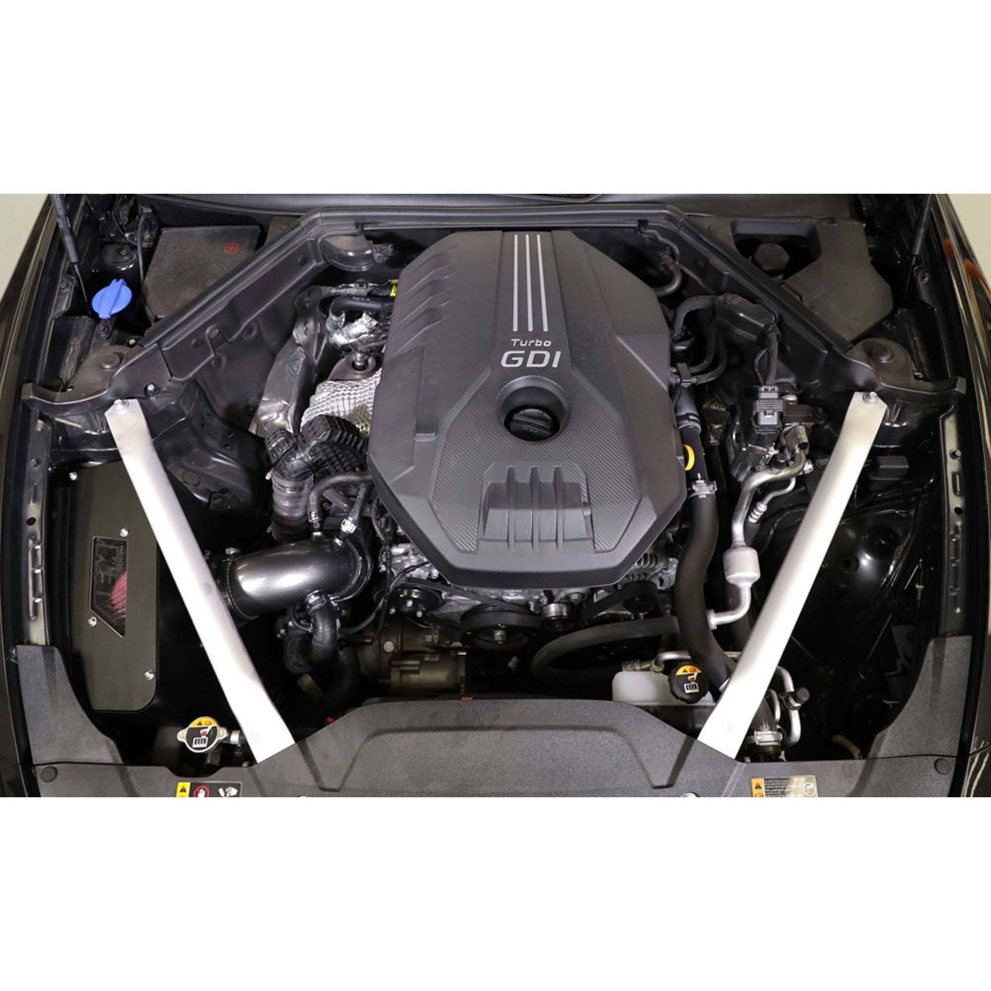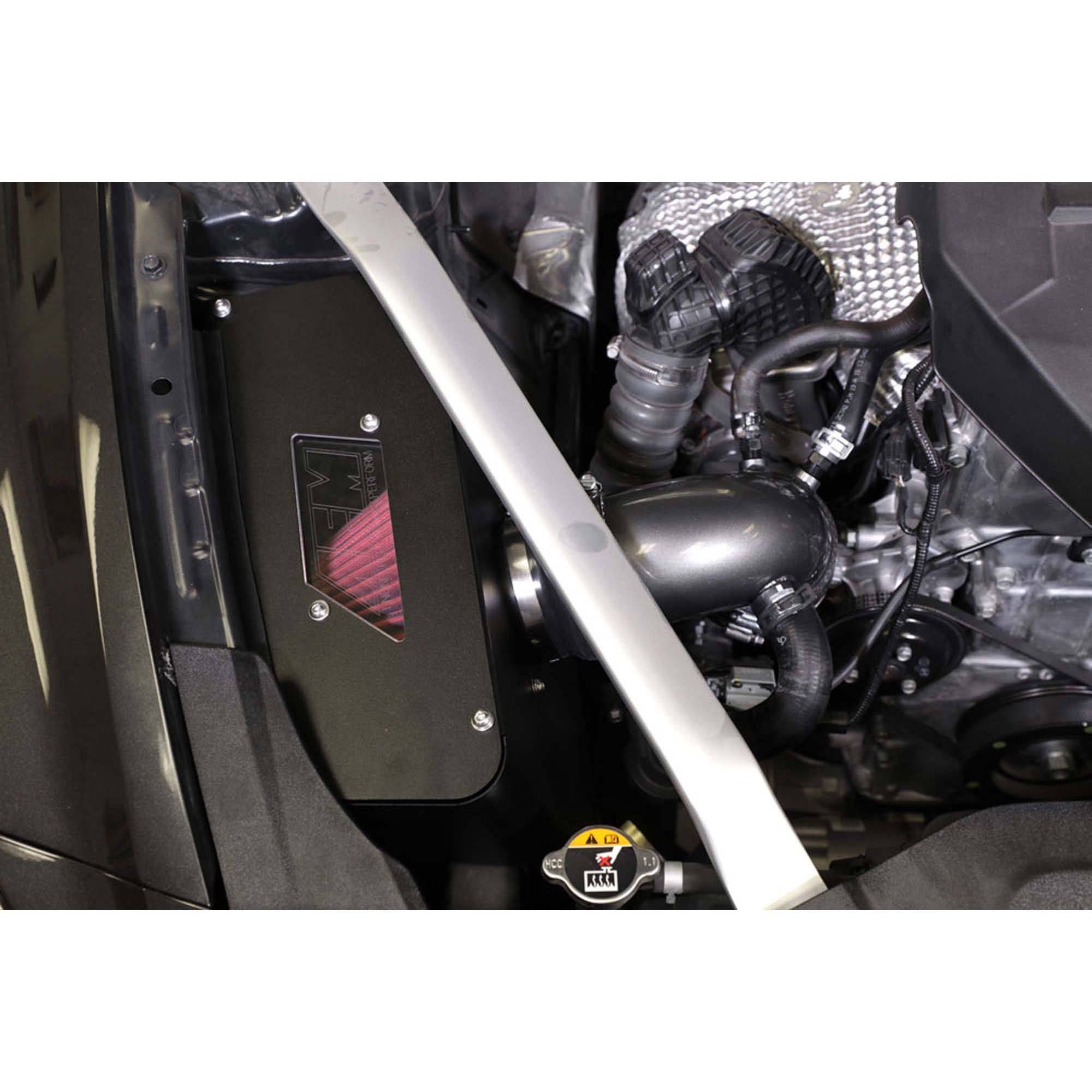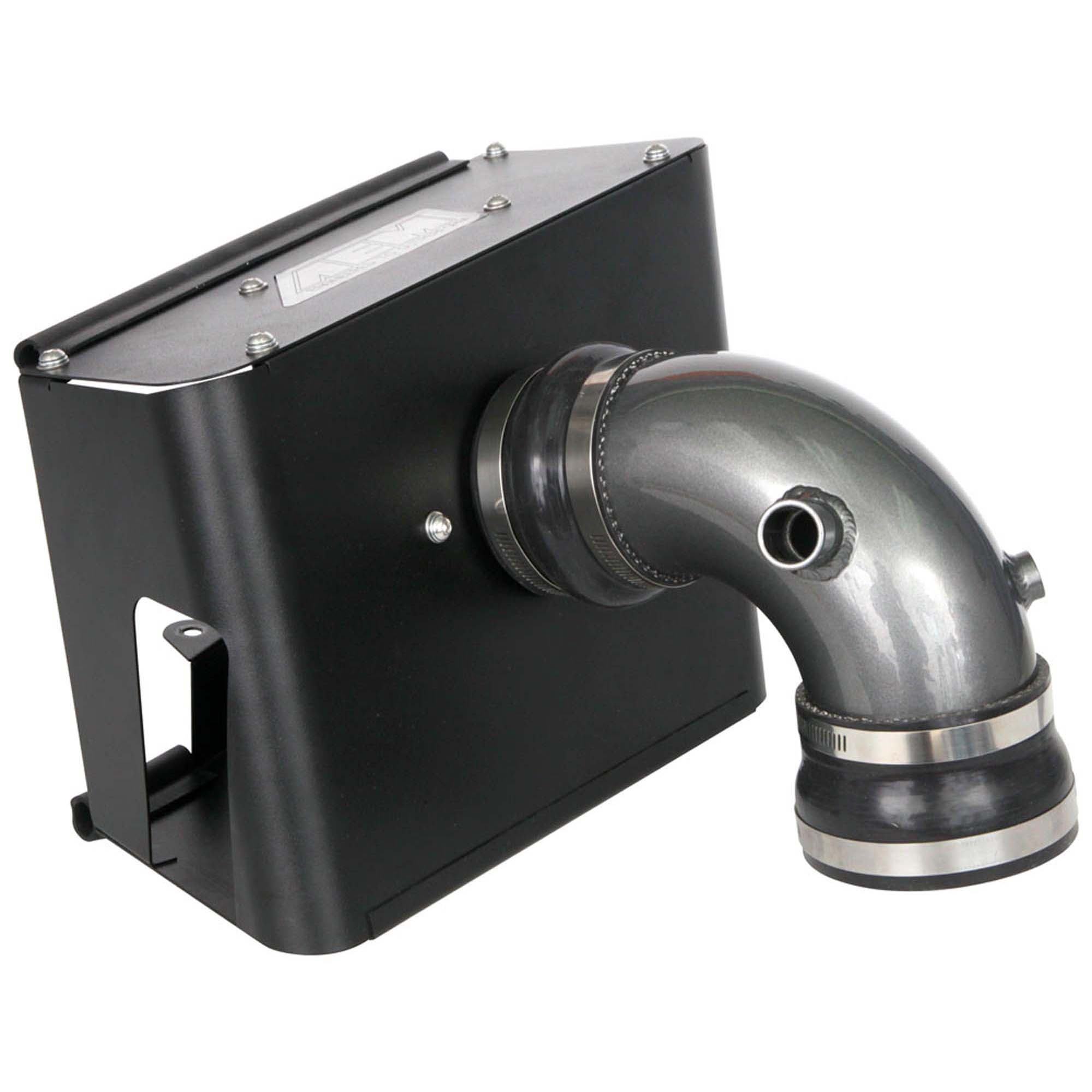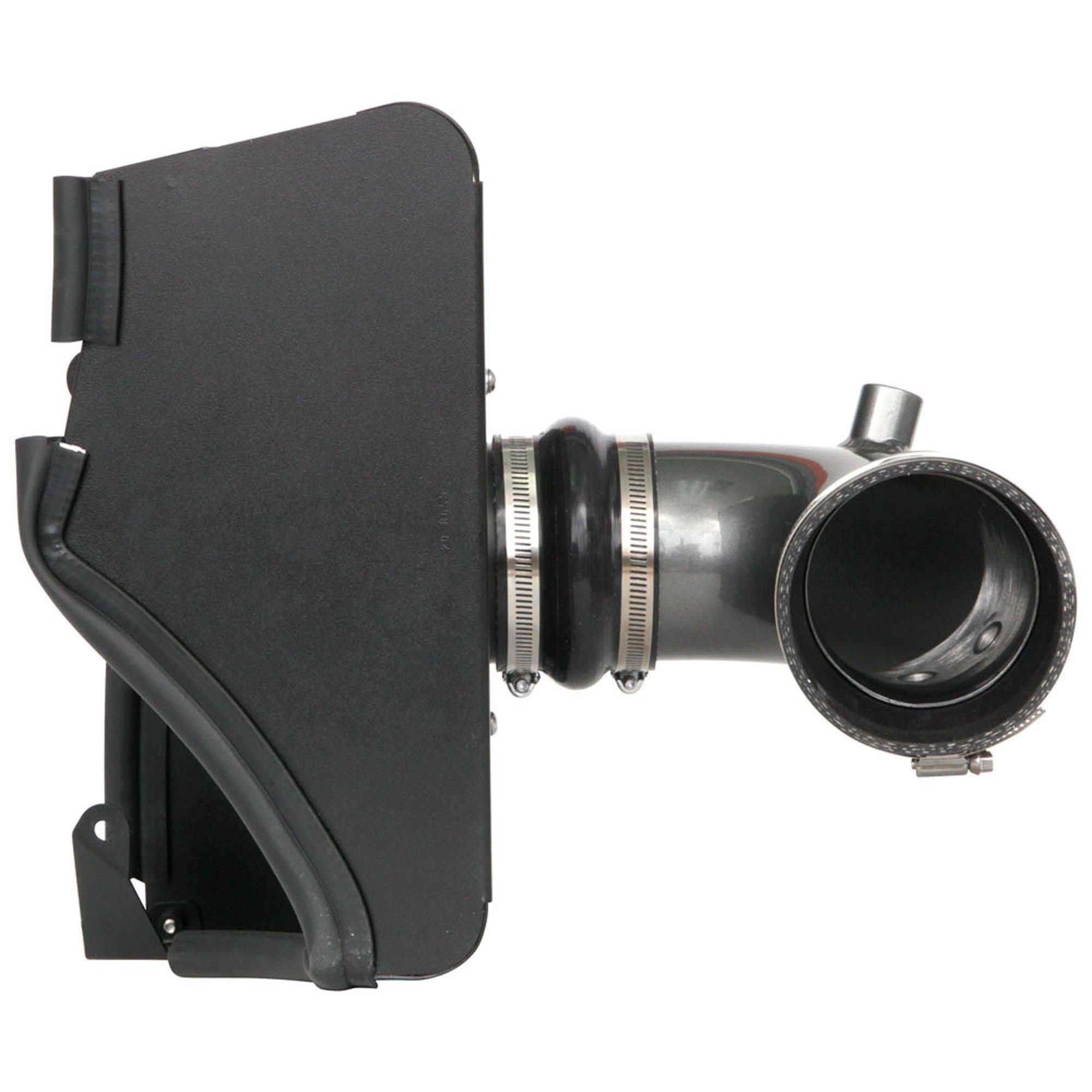 The air filter is located in the original air box space and is protected by a heat shield which is designed to reduce intake air temperature and increase horsepower. The air intake tube is constructed from mandrel-bent aluminum featuring a durable gunmetal gray powder coated finish. This air intake system was developed to accommodate the engine’s factory emissions control devices including the mass airflow sensor and breather tube.