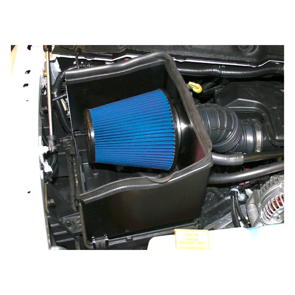 The panels mount in the factory air box location and utilize any factory cold air inlet ducts that are present, while adding additional cold air passages to the filter. The panels also keep the filter isolated from the hot engine compartment air by sealing to the underside of the hood via blade-style weather stripping. This air box system connects to the factory air intake tube.