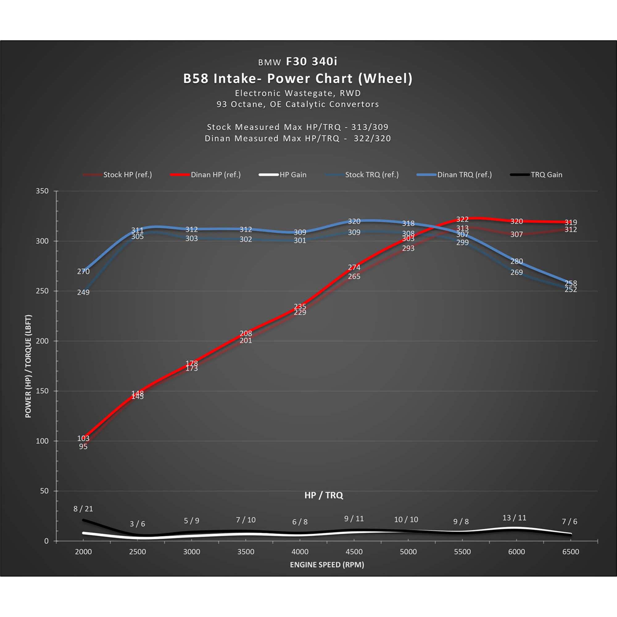 These 2 specific details are diametrically opposed to our intended market’s desires so the removal of these features was paramount. Through numerous iterations, a carbon fiber intake tube was developed that eliminated flow disruptions and allowed the natural sound of an unimpeded intake tract to sing. All told this thorough methodology of design allows the Dinan carbon fiber cold air intake for the B58 engine to elicit gains of 15 HP and 13 TRQ6000 RPM on a completely stock vehicle. An impressive feat on today’s turbocharged engines. Not to be outdone by the performance side of the equation the B58 intake also is completely made up of carbon fiber unlike 6 cylinder intakes of the past where a mix of materials was used. Not only is the intake completely carbon construction but the quality of the material has been improved over previous generations as well.