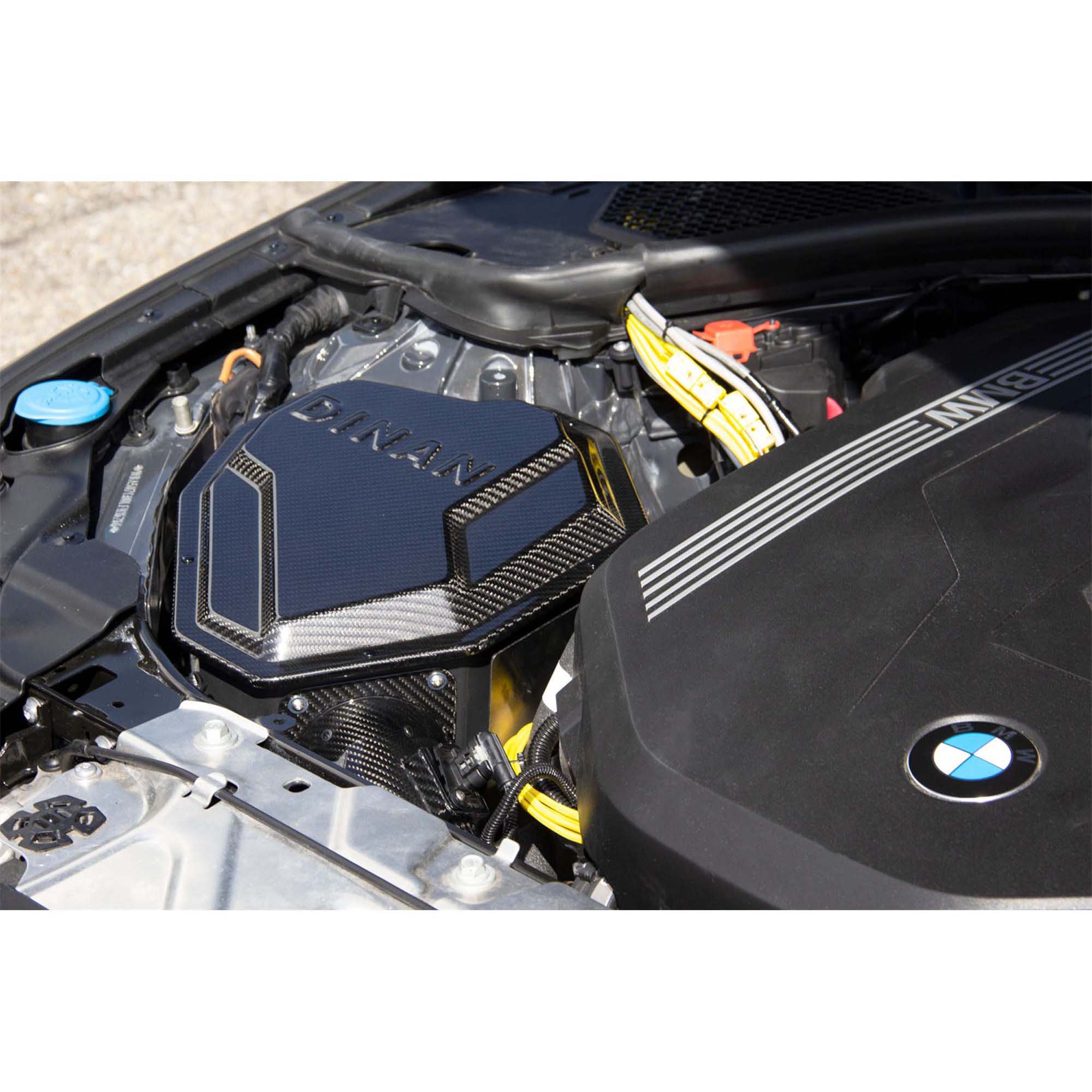 The Dinan carbon fiber intake for the platform rights these wrongs and delivers a semi-open intake capable of flowing 58% more air than the stock system resulting in additional top end power and increased throttle response. At the same time revealing a more aggressive, sporty carbon fiber appearance, and an increase in sound courtesy of the removal of the intake resonator and implementation of a semi-open design. In order to achieve the gains in flow that set the Dinan intake system apart, the entire lower box of the system, and not just the lid, has been reworked and enlarged in an effort to make use of as much of the available real estate as possible within the engine bay.