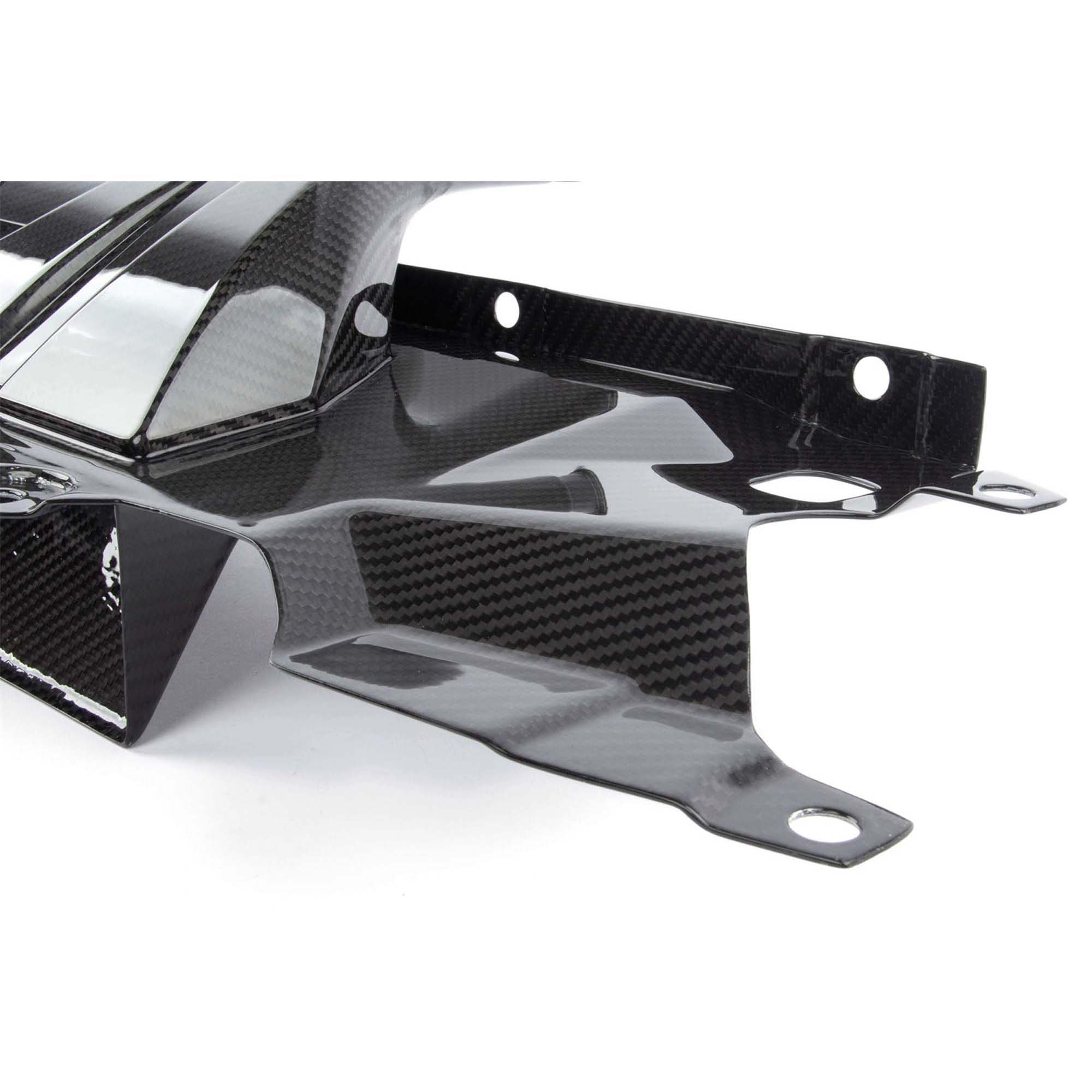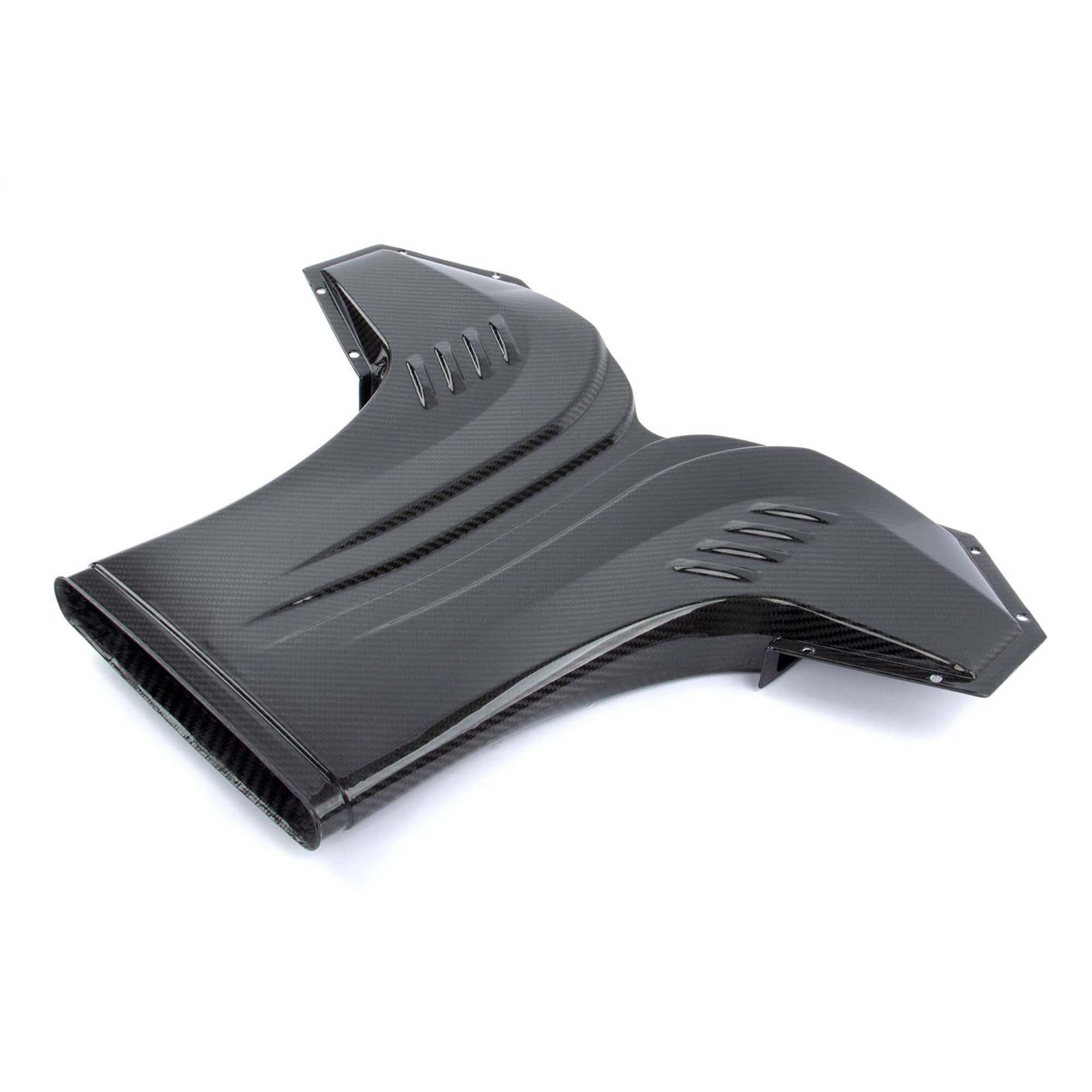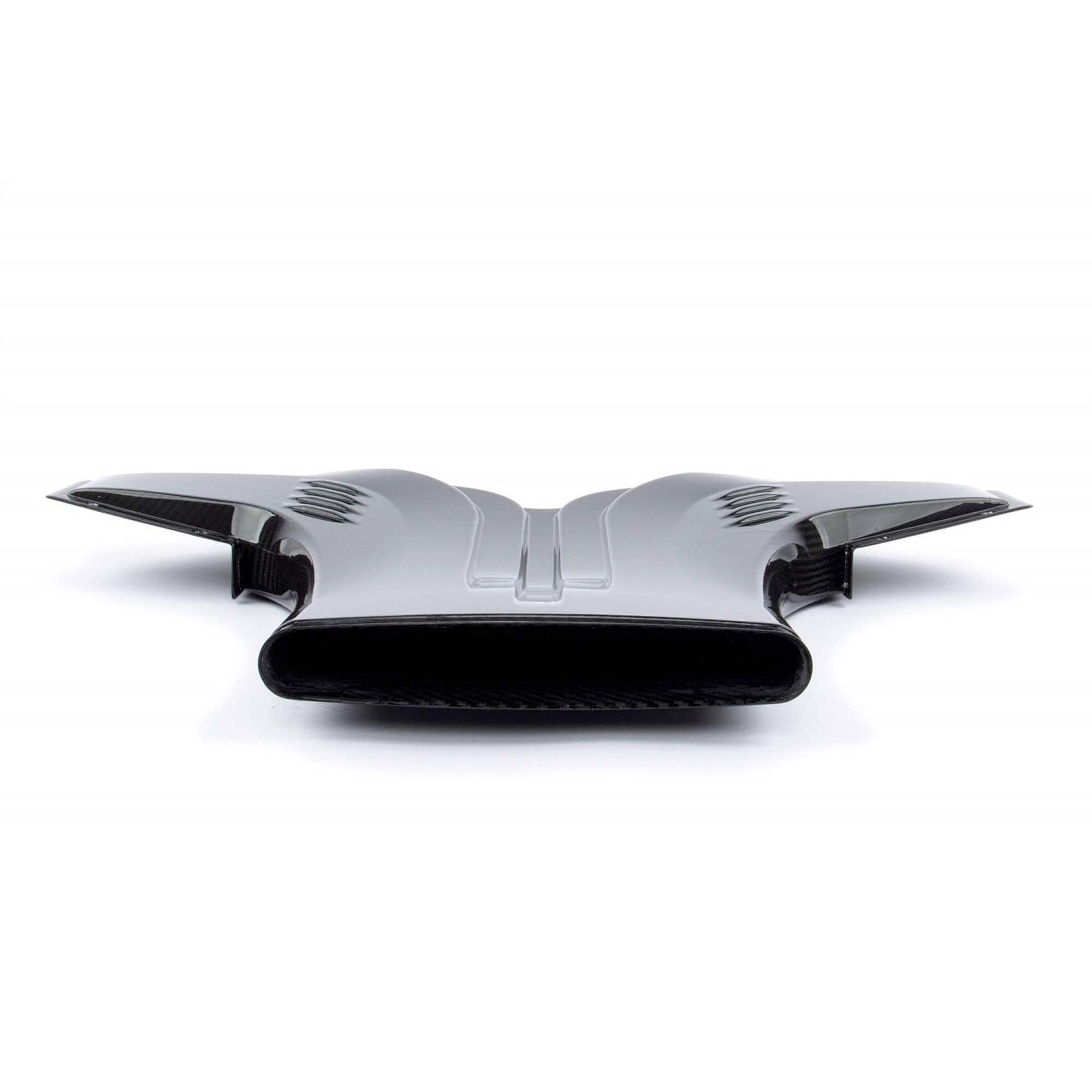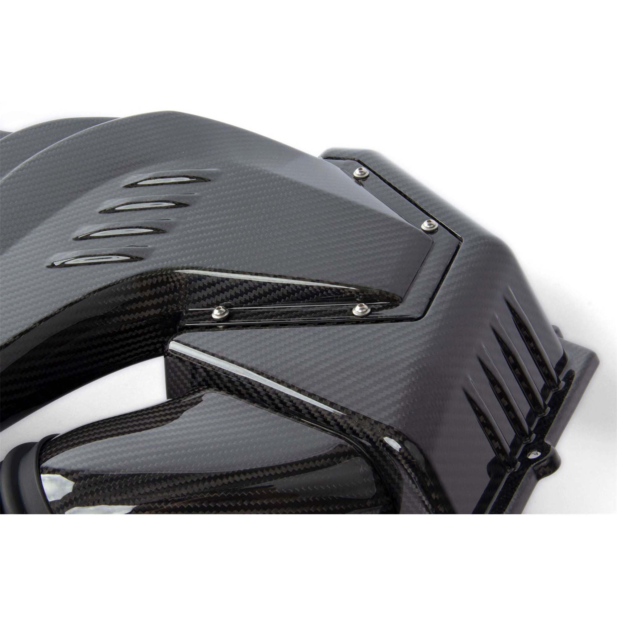 Through constant CFD analysis, the design of the scoop and secondary inlet continually underwent improvements in order to meet the demand of an even and un-agitated air supply to each air box. In its final form, accents in the carbon both provided a visual embellishment as well as created the outward manifestations of the runners used to direct and smooth the secondary air flow. The additional air flow ultimately supplements the factory inlet locations on both the left and right air boxes with ambient air from outside of the engine compartment. These air boxes have been enlarged and equipped with massive filters to handle this increased volume and together with the rest of the system allow the intake to flow as efficiently as possible.
