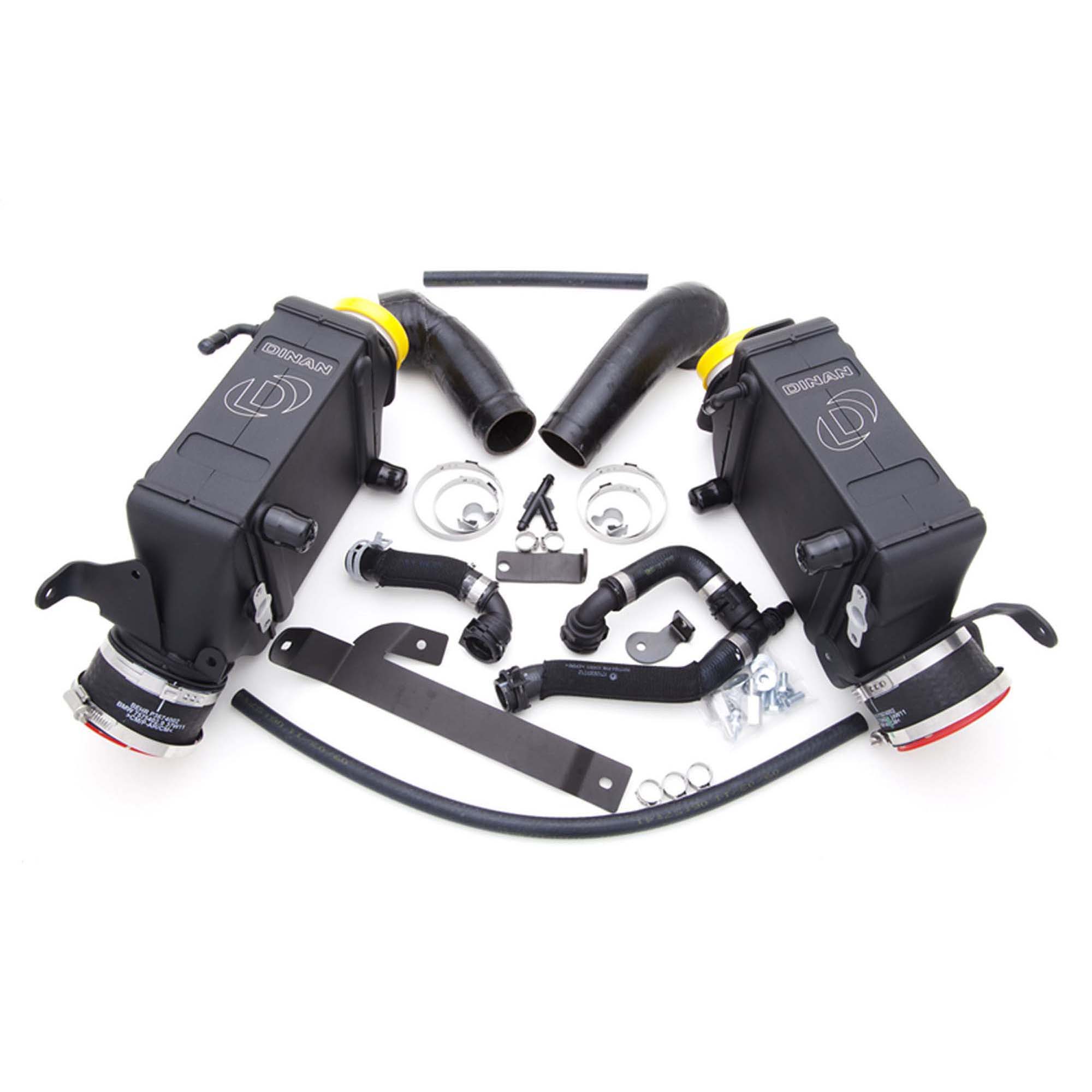 The two intercoolers are beautiful and purposeful looking wrapped in black powdercoat and laser engraved with the Dinan logo.