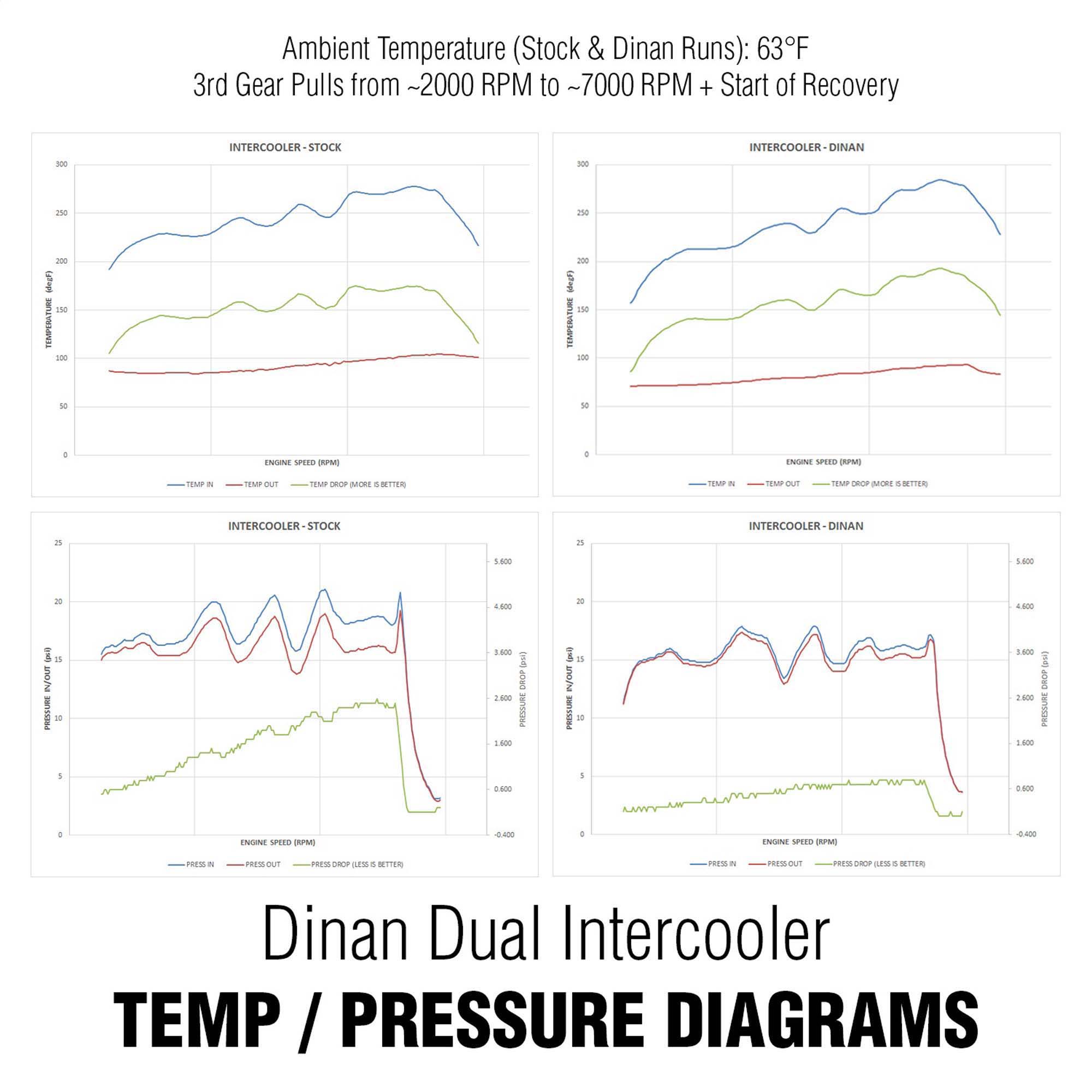 Dinan’s unique dual-core design allows 2 separate cores to be working in conjunction with one another at all times. This doubling of resources is directly responsible for a 39% improvement in the delta from charge air temperature to ambient temperature (see diagrams). “Cool down” time is also significantly reduced enabling the cars to produce full power under varying driving conditions such as stop and go traffic. This leaves the chances of being susceptible to heat soak nearly a thing of the past.