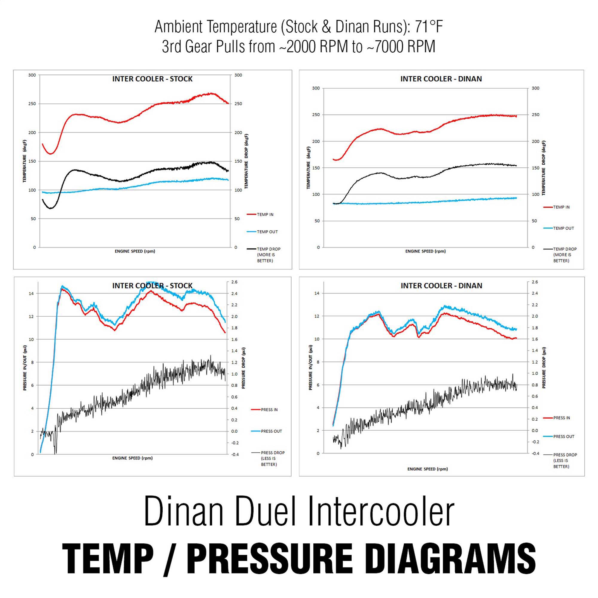 Greater power gains are achieved with a larger high-performance intercooler. The Dinan intercooler provides a 93% increase in total volume, substantially reducing the pressure drop by 0.7 psi, as well as providing more efficient heat exchange. “Cool down” time is also reduced enabling the cars to produce full power under varying driving conditions such as stop and go traffic.