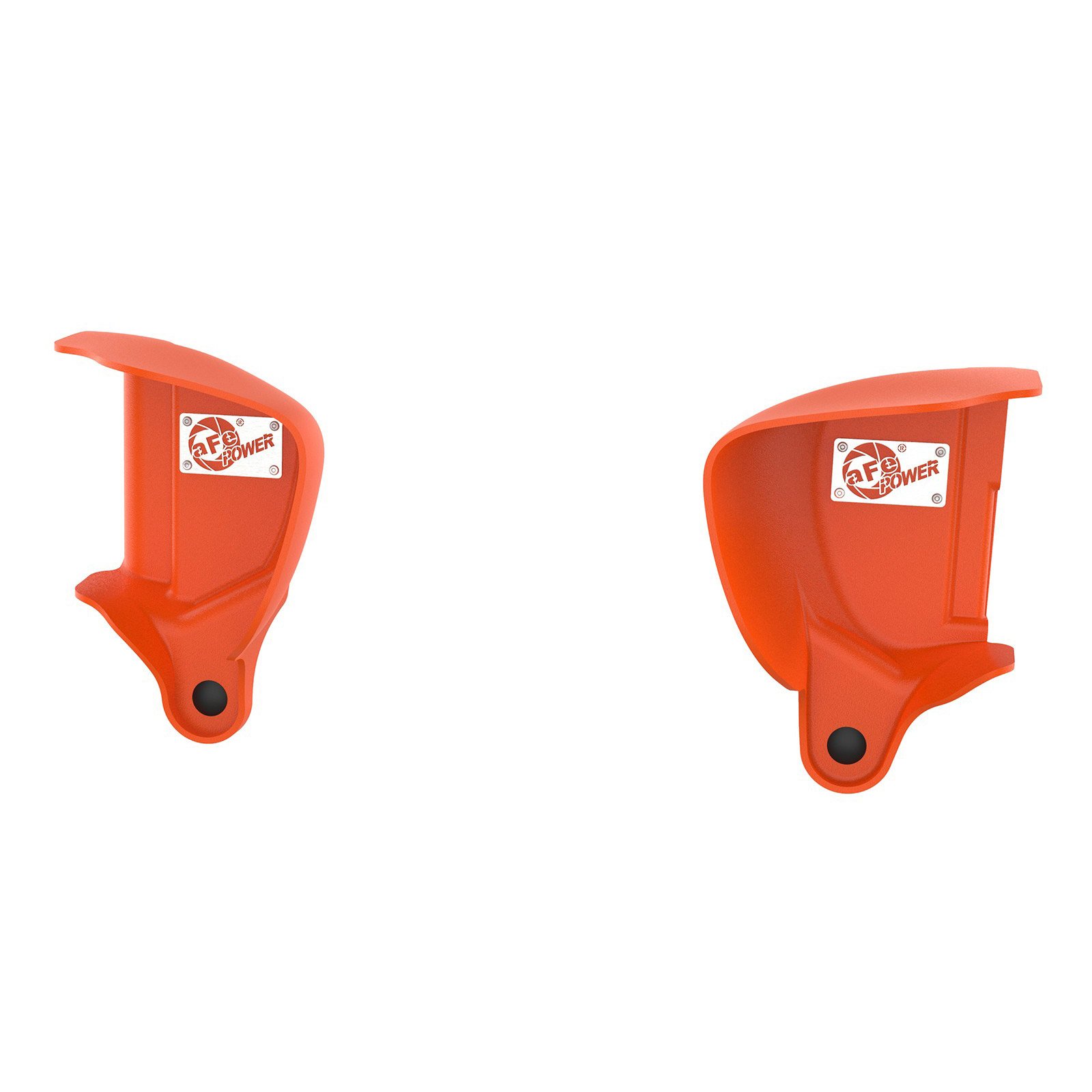 These air scoops are installed through the front kidney grille openings and are secured to the reinforcement support bar with the included plastic push-in rivets. They sit right in front of the radiator and are designed to fit with the factory radiator. No modifications are required for installation with factory and aFe POWER intake systems.
