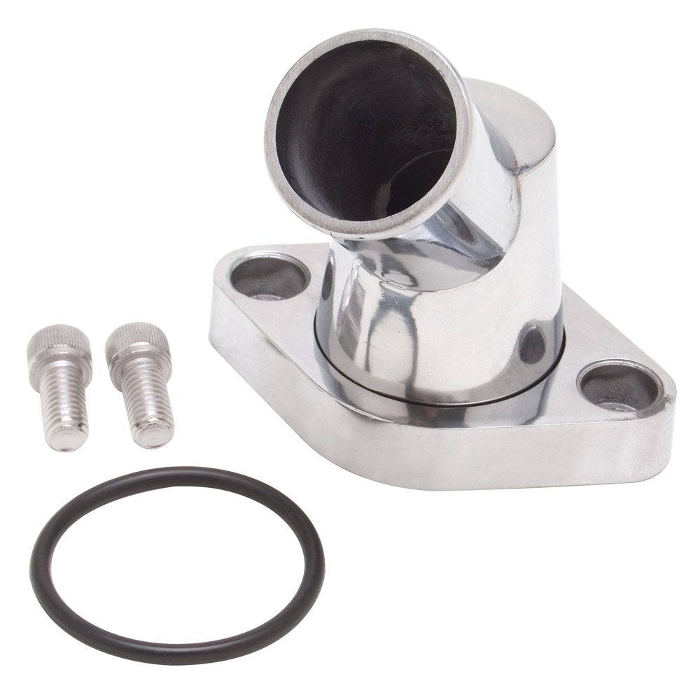 Edelbrock part #4817 Waterneck is designed for use with Chevy 4.3L V6 & Chevy V8 engine applications. This polished water neck is a great way to finish off your engine. It features a 45 deg. neck and O-ring design for an improved seal, which also allows for removal without requiring a new gasket. Fits any 1-1/2″ diameter outlet hose.
