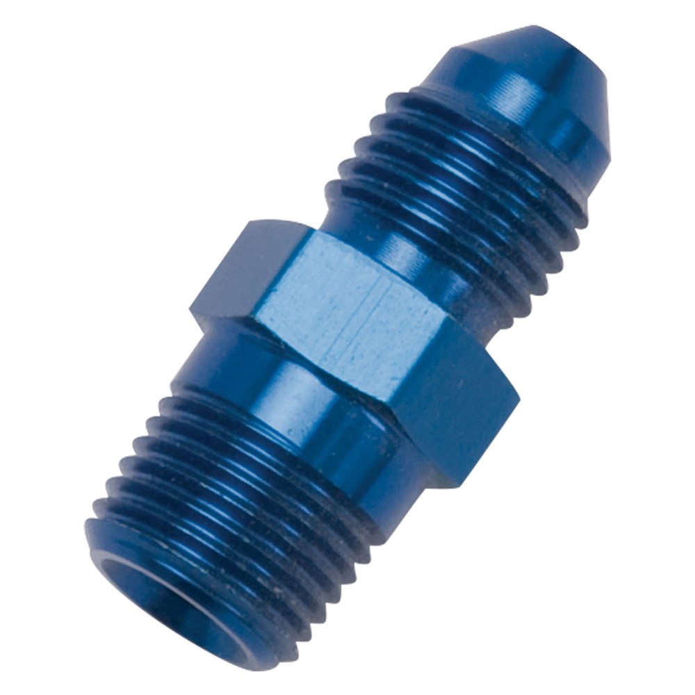 Edelbrock part #76522 Flare to Pipe Fitting features a 3 AN – 1/8″ NPT straight end with blue anodized finish. Use the AN size that matches your hose and the NPT (National Pipe Thread) size that matches the component you are plumbing.