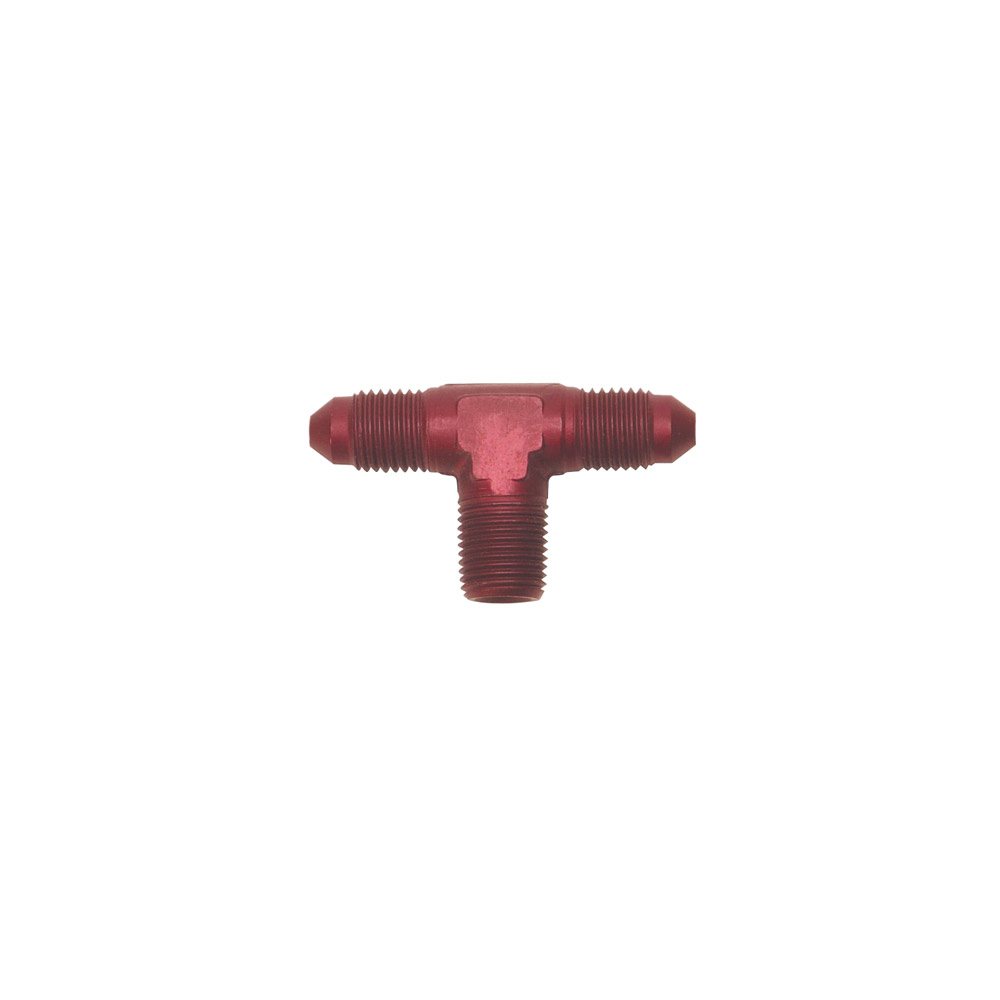 Edelbrock part #76526 Flare to Pipe T Fitting features a 3 AN – 3 AN – 1/8″ NPT ends with red anodized finish. Use the AN size that matches your hose and the NPT (National Pipe Thread) size that matches the component you are plumbing.