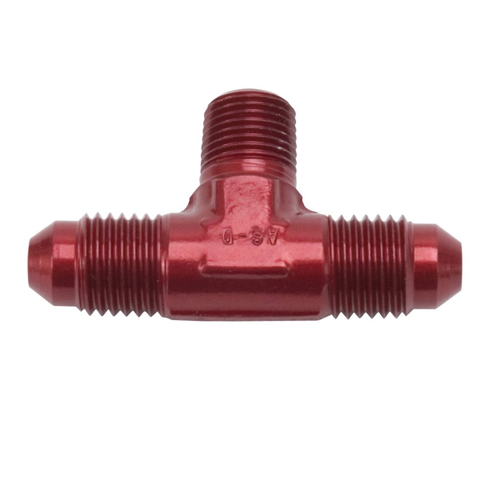Edelbrock part #76548 Flare to Pipe T fitting features a 4 AN – 4 AN – 1/8″ NPT ends with red anodized finish. Use the AN size that matches your hose and the NPT (National Pipe Thread) size that matches the component you are plumbing.