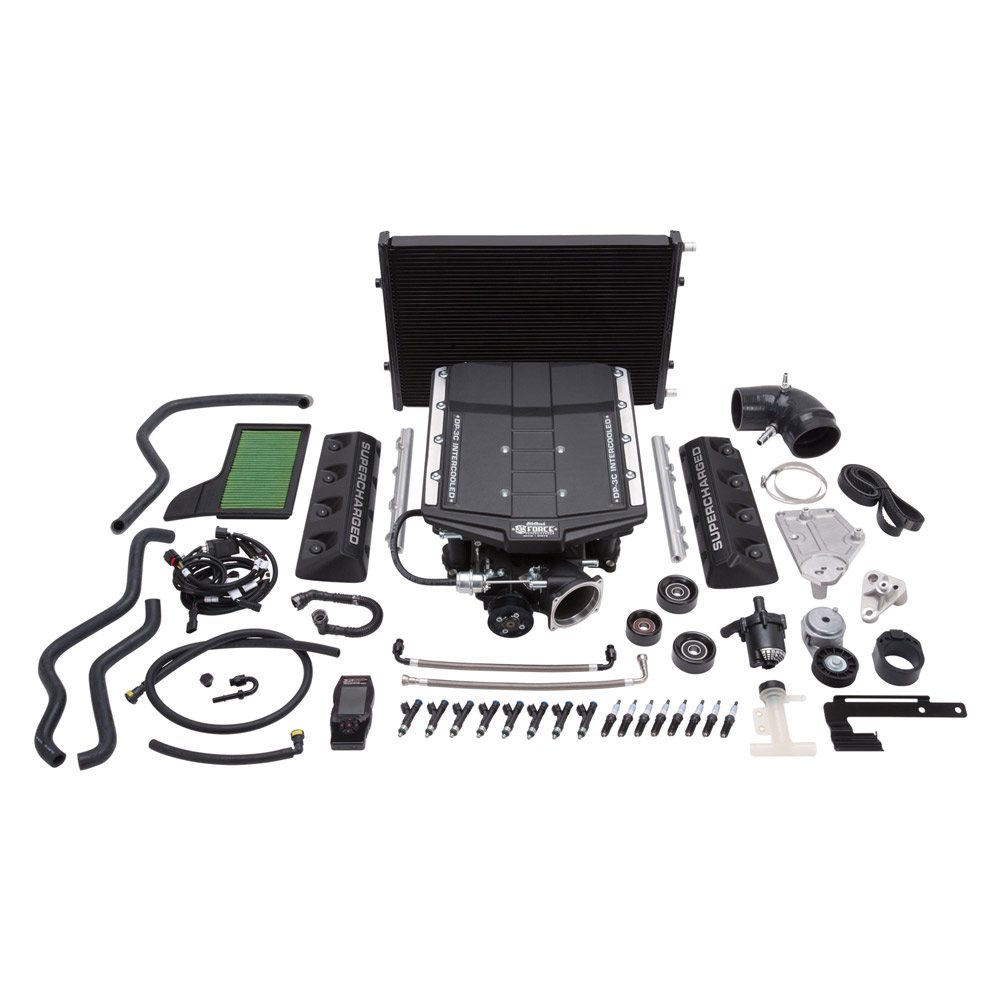 The Edelbrock E-Force Supercharger Stage 2 Track system part #15862 for 2015-17 Ford Mustang increases the performance of your Coyote engine to 731 horsepower and 588 ft/lbs. of torque at the crank. The core of this system is the Eaton Gen VI 2300 TVS Supercharger rotating assembly with a four lobe design with 160 degrees of twist for maximum flow, minimum temperature rise and quiet operation for excellent drivability. We also designed our superchargers with an integrated bypass valve to help eliminate parasitic loss under light throttle, improving mileage potential. Our unique and efficient inlet configuration results in a shorter, less restrictive intake path for improved air flow, without the need for a jack-shaft. Keeping the air cool is a high capacity air to water intercooler and low temp heat exchanger. The Edelbrock #15862 supplied tune is intended for completely stock vehicles with the exception of a cat-back exhaust.
