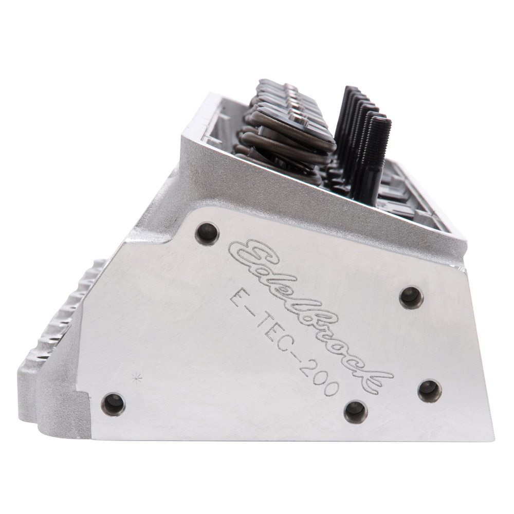 The Edelbrock #60985 E-Tec cylinder head is replacements for 302, 327, 350 & 400 c.i.d. S/B Chevy engines with “Vortec-style” manifolds. They feature an LT1-style raised runner intake port design for increased air-flow and ultimate performance. A unique combustion chamber design positions the spark plug closer to the center of the cylinder, promoting a more efficient combustion resulting in more power. This head includes an adjustable rocker stud and guide plate set-up for use with adjustable rockers or washers to properly position the stud height to accommodate factory style self-aligning rocker arms. They have 20% more exhaust flow than a cast iron Vortec head, great performance up to 6000 rpm and can produce 9.5:1 compression with stock pistons in 350 cubic-inch engines. RPM E-Tec cylinder head is dual-drilled and will accept 1987-95 center bolt and/or 1986 & prior perimeter flange mount valve covers and most stock exhaust manifolds.