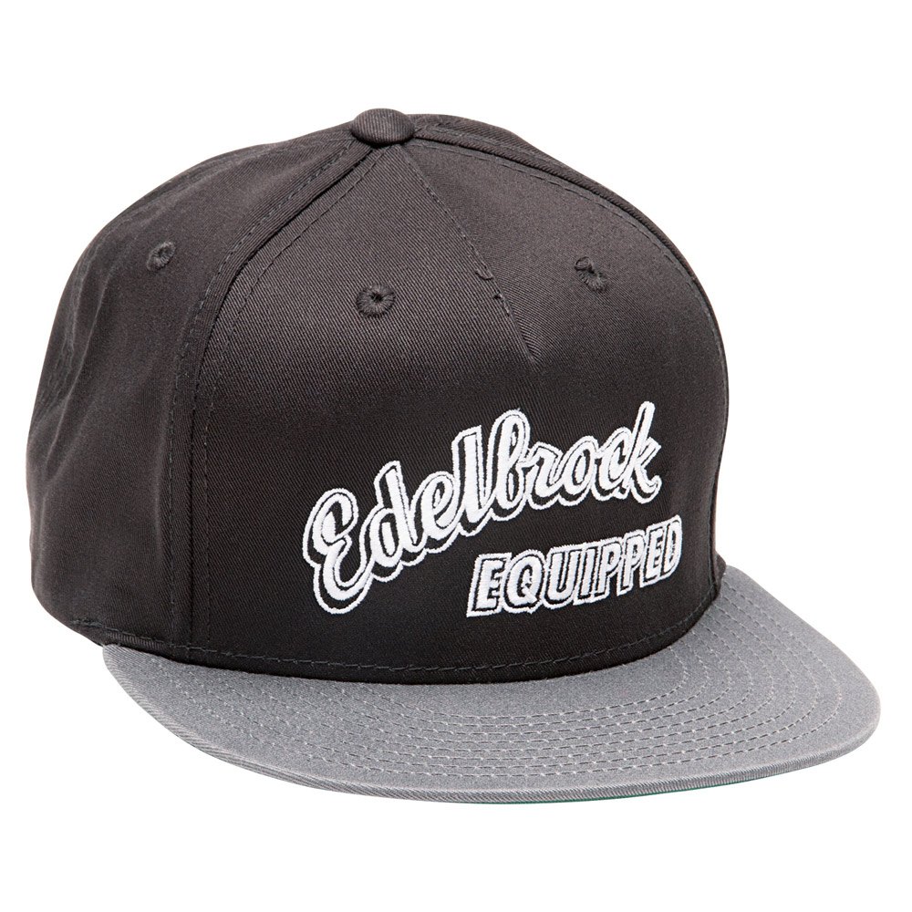 The Edelbrock EQUIPPED Snapback hat is 100% Acrylic with the Edelbrock Classic Script Embroidery on the front. This 5-Panel snapback is adjustable for all sizes and has a Green underbill.