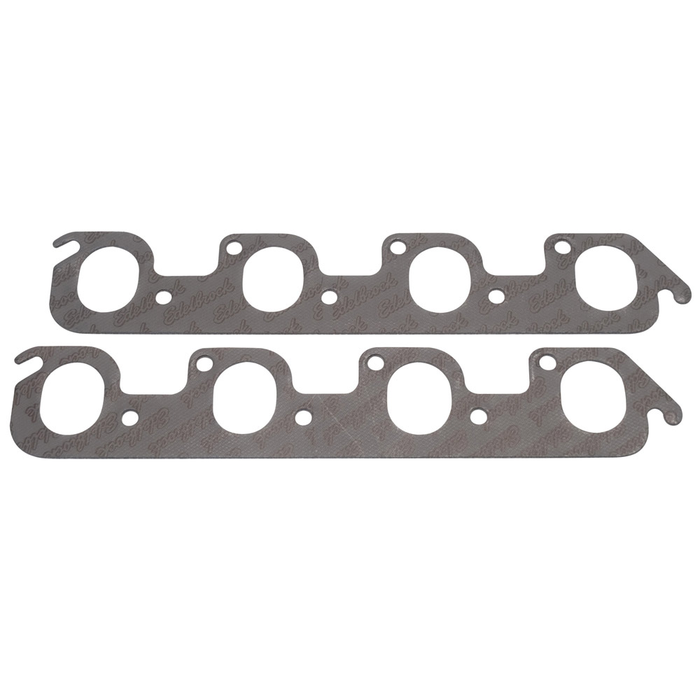 a high-density non-asbestos fiber/metal core composite material consisting of two graphite coated, heat resistant fiber blended sheets that are mechanically and chemically fused to an expanded steel core. The finished product provides high heat resistance, excellent load retention and unmatched sealing performance on exhaust manifold and header applications. A 50% recovery rate allows for gasket expansion in the event your header loses the proper header bolt torque. Gaskets future a 1.98″x 1.56″ port size. Edelbrock part #7262 Exhaust Gaskets are designed for 1970-74 351 Cleveland V8 engines & 302 E-Boss, 351W E-Boss (Clevor) Conversions. These Exhaust Gaskets are made of EnCore HTX-900