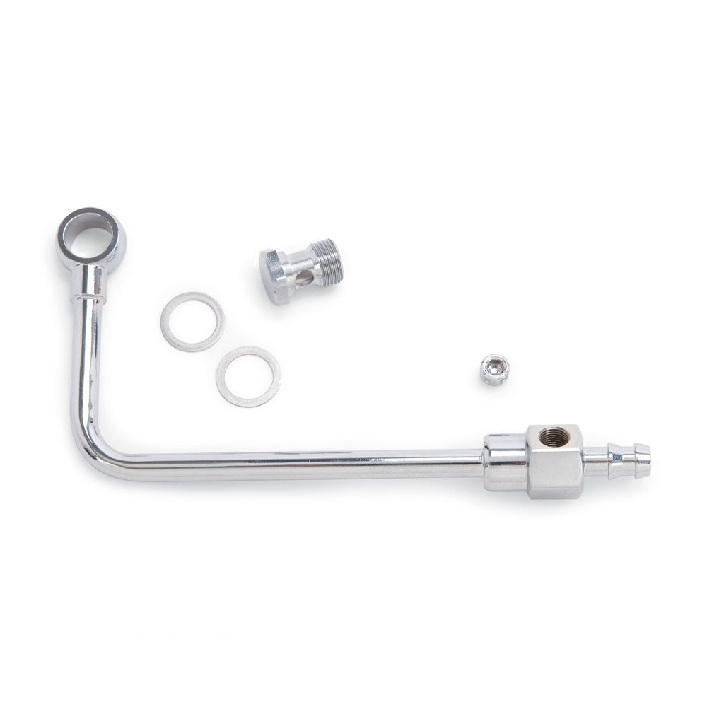 This Edelbrock #8126 Chrome Steel Fuel Inlet for Edelbrock carburetors provide a clean and custom plumbing solution. The drop-down design routes the fuel line on the right-hand (passenger side) of the carburetor below the linkage and choke housing. Includes a barbed end for a push-on 3/8″ rubber fuel line. The Edelbrock #8126 is manufactured of plated steel and include a 5/8″ -20 threaded banjo bolt with gaskets.