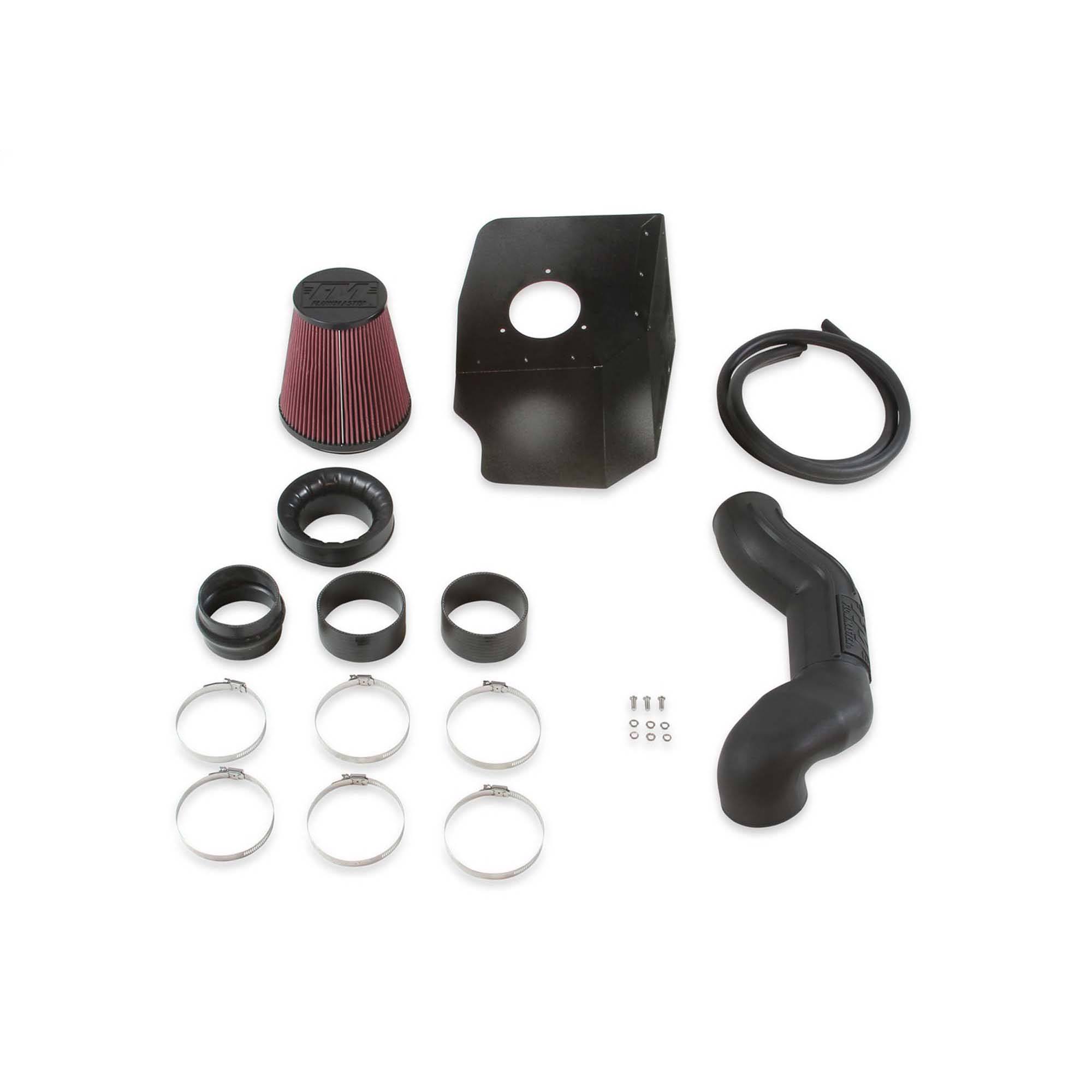 The Delta Force system contains an ultra-trick looking, custom molded black Cross-Linked Polyethylene (XLPE) high-flow intake tube, black anodized aluminum fittings (when applicable), high quality reinforced silicone couplers and all stainless steel hardware. Other features include a large diameter high-flow conical shaped 8 layer cotton gauze air filter, which traps more dirt than typical 6 layer designs, a custom-fit black powder-coated air dam with attachment brackets to securely mount the system in place along with soft bumpers to eliminate any metal to metal contact under the hood.