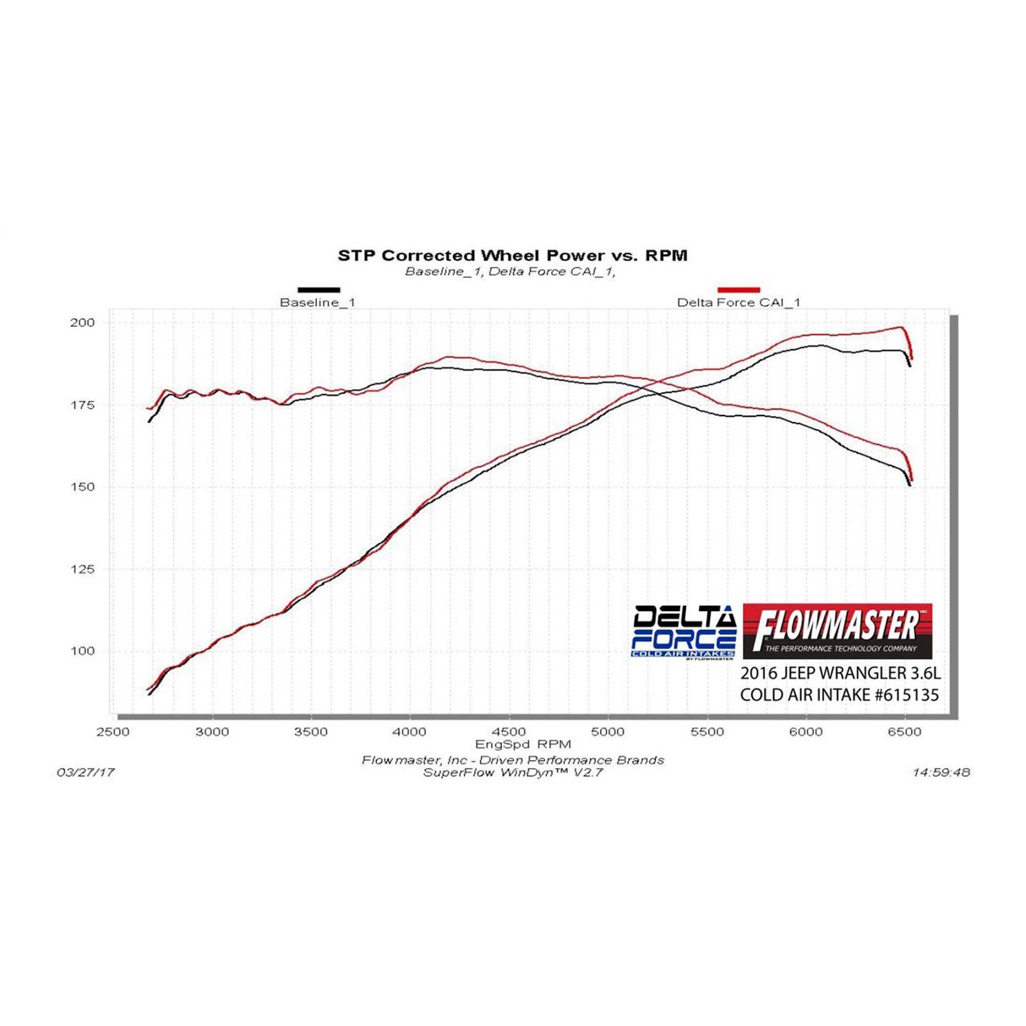 Take the performance of your vehicle to the next level with the addition of Flowmaster’s new Delta Force Performance Air Intake system for 2012-2018 Jeep Wrangler (2 & 4 doors) with 3.6L engine. The Delta Force system contains an ultra-trick looking, custom molded black Cross-Linked Polyethylene (XLPE) high-flow intake tube, black anodized aluminum fittings (when applicable), high quality reinforced silicone couplers and all stainless steel hardware.
