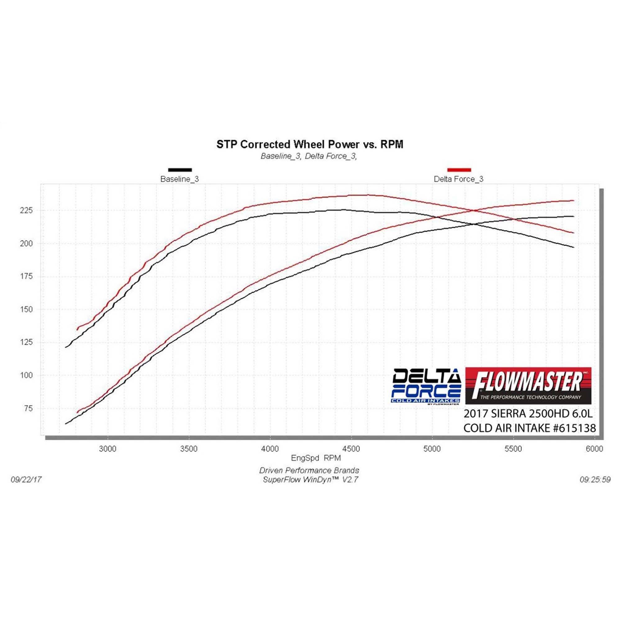 Take the performance of your vehicle to the next level with the addition of Flowmaster’s new Delta Force Performance Air Intake system for 2016-2018 GM 2500HD Silverado/Sierra with 6.0L engine. The Delta Force system contains an ultra-trick looking, custom molded black Cross-Linked Polyethylene (XLPE) high-flow intake tube, black anodized aluminum fittings (when applicable), high quality reinforced silicone couplers and all stainless steel hardware.