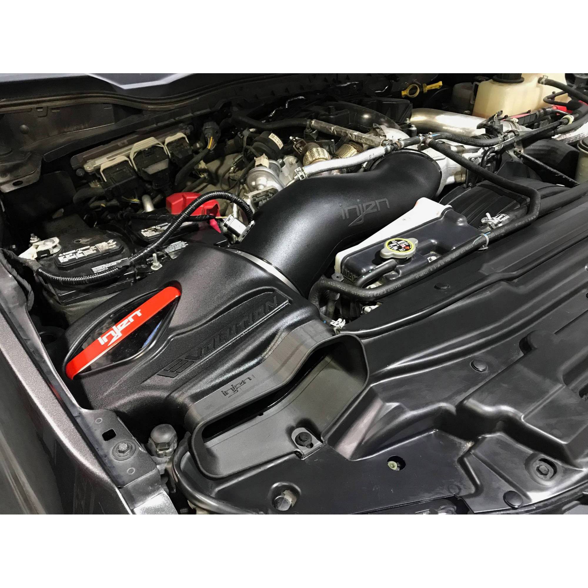The Injen EVO9004 cold air intake system for our 2017-2019 Ford F-Series Diesel Truck is truly on the next level. From the one-piece sealed housing that utilizes our patent pending Twist-Lock technology to securely attach our massive SuperNano-Web Dry air filter, to the seamless fitment of our battery relocation tray, to our patented internal MR Technology that ensures maximum performance with zero risks of check engine lights, all the way down to engineering a kit that utilizes all factory harnesses to avoid unnecessary extensions that our competition uses, to provide a simple and OE style install. Injen has pulled out all the stops to provide you with the best intake possible for your 2017-2019 Ford F-Series Diesel Truck!