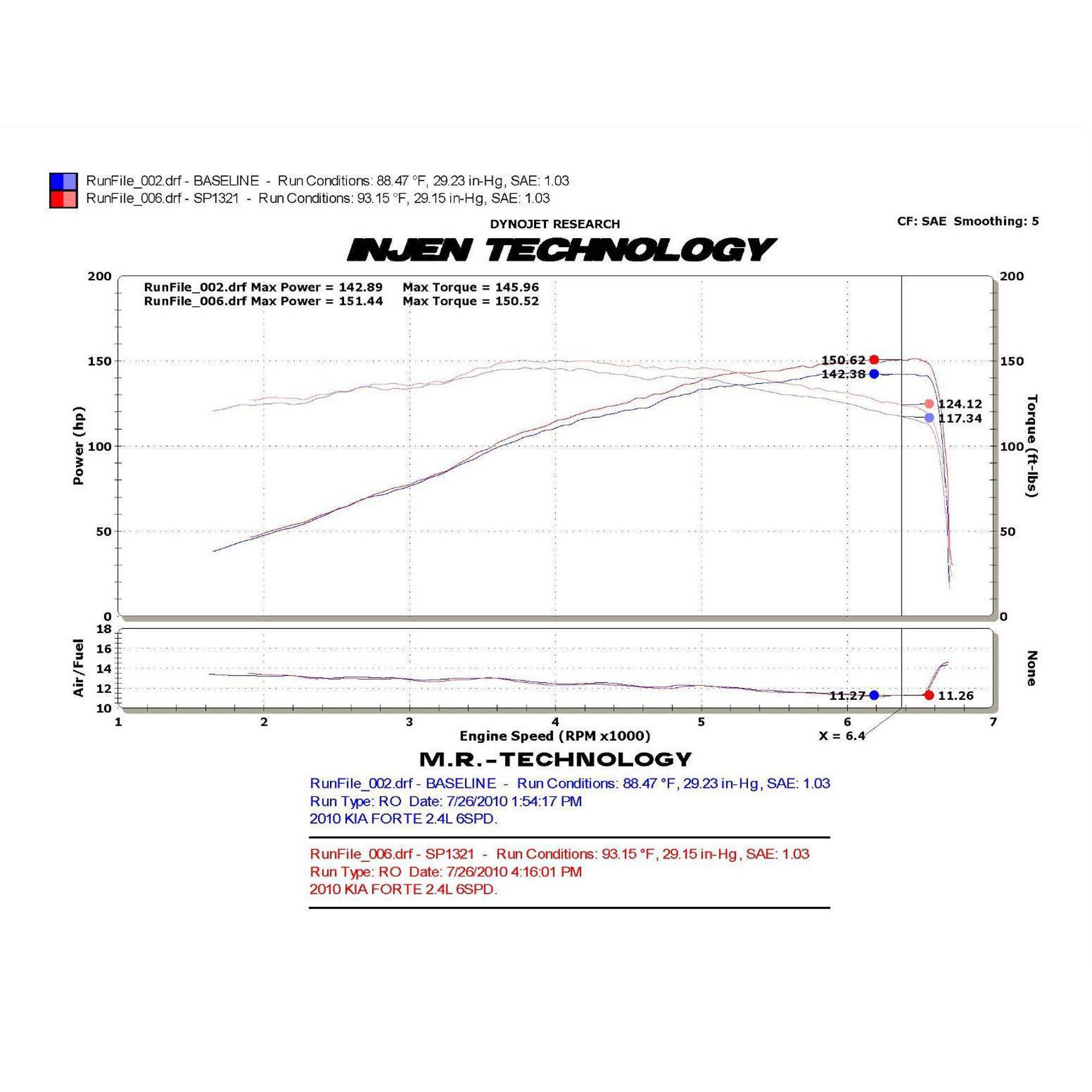 The soul of this intake is found within 6061-T6 aluminum air intake tube that provides a smooth uninterrupted path for highly efficient airflow. Our engineers have painstakingly designed the intake to provide the highest levels of safe power, along with clean aesthetics that will impress every time you open your hood. In addition to the impressive power increase, the Injen team has ensured that a safe Air fuel (A/F) ratio has been maintained throughout the power band.