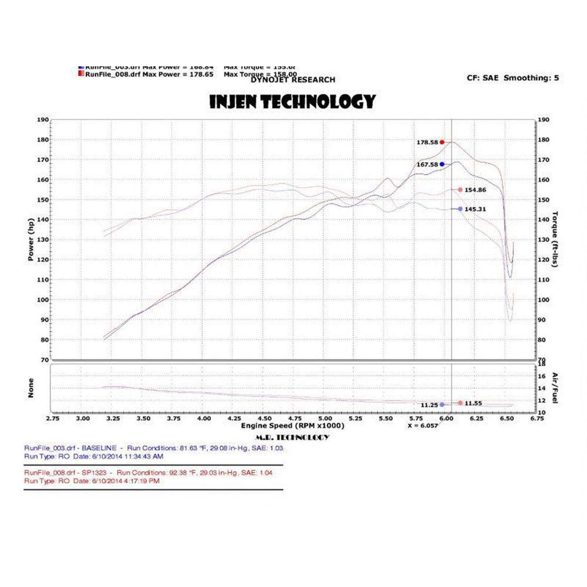 The soul of this intake is found within 6061-T6 aluminum air intake tube that provides a smooth uninterrupted path for highly efficient airflow. Our engineers have painstakingly designed the intake to provide the highest levels of safe power, along with clean aesthetics that will impress every time you open your hood. In addition to the impressive power increase, the Injen team has ensured that a safe Air fuel (A/F) ratio has been maintained throughout the power band.