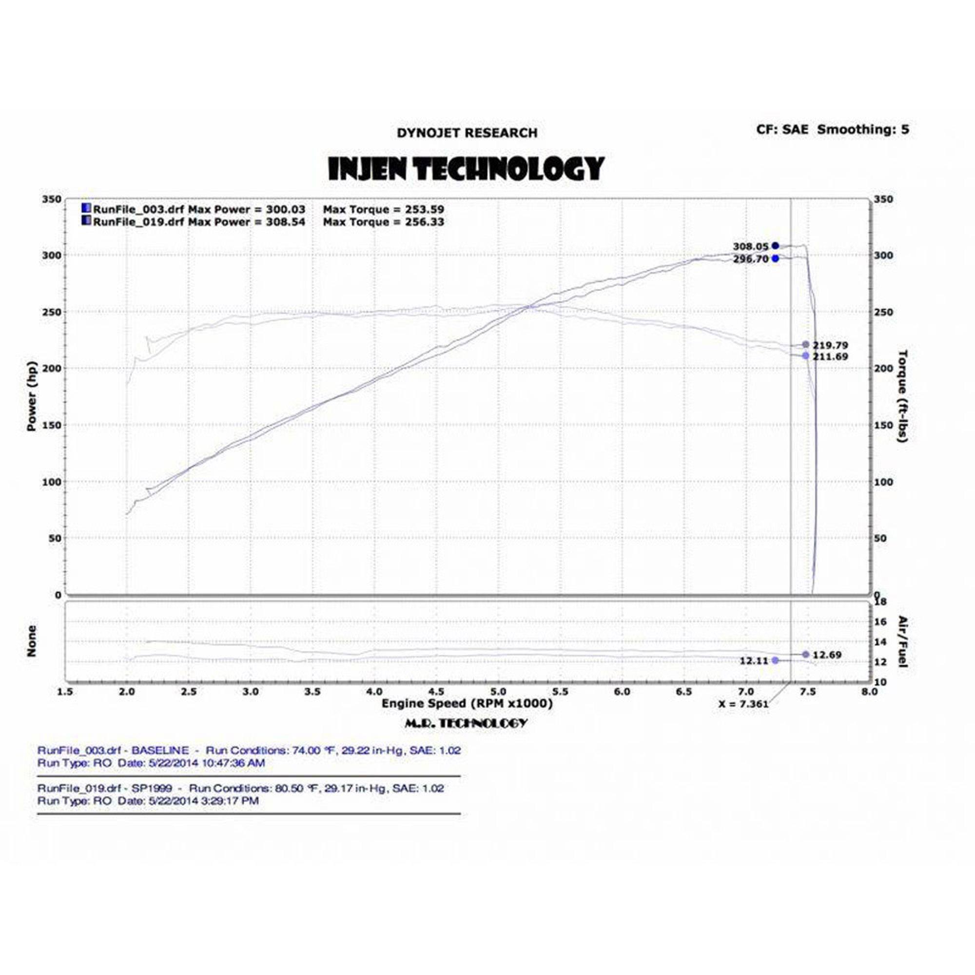 The soul of this intake is found within 6061-T6 aluminum air intake tube that provides a smooth uninterrupted path for highly efficient airflow. Our engineers have painstakingly designed the intake to provide the highest levels of safe power, along with clean aesthetics that will impress every time you open your hood. In addition to the impressive power increase, the Injen team has ensured that a safe Air fuel (A/F) ratio has been maintained throughout the power band.