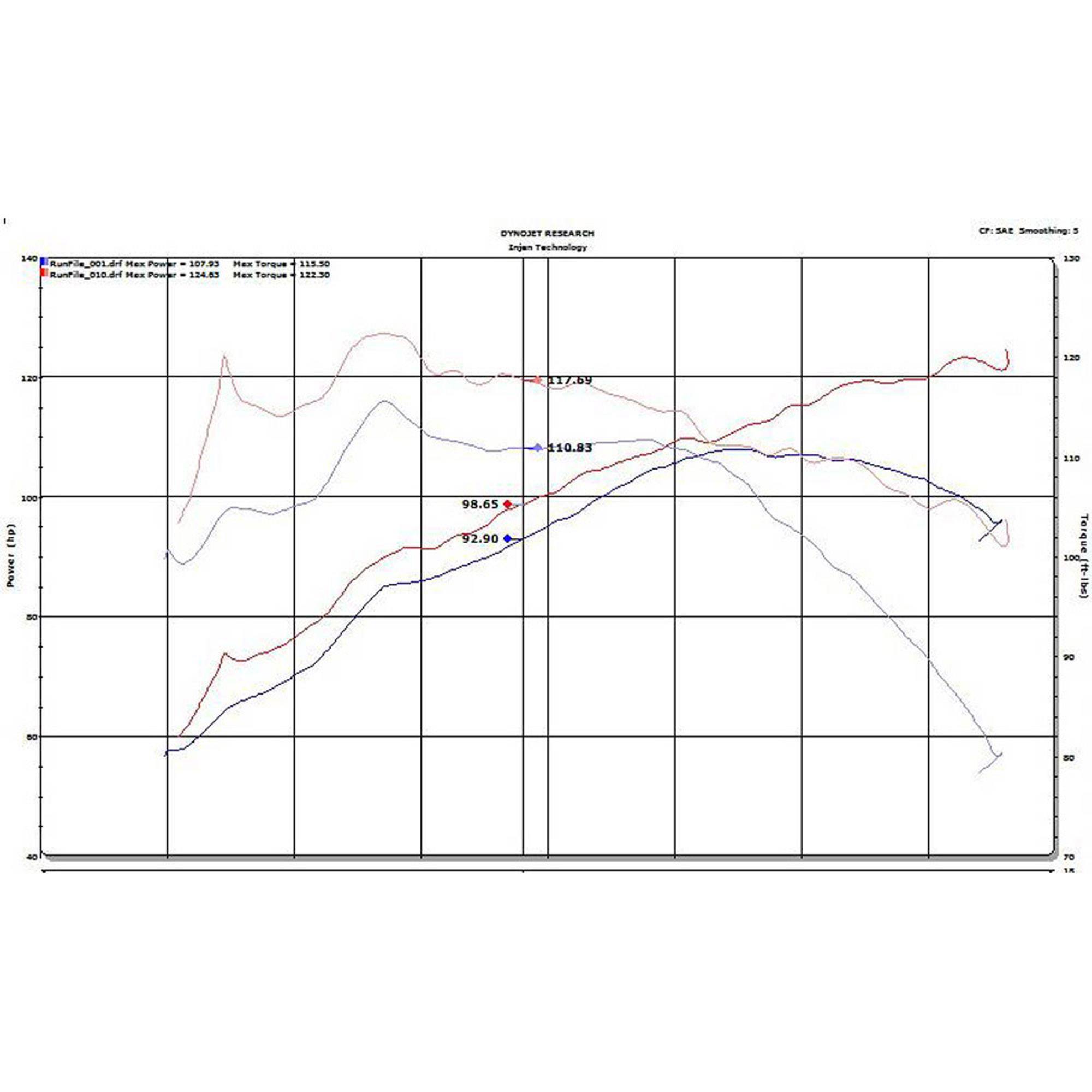 The soul of this intake is found within 6061-T6 aluminum air intake tube that provides a smooth uninterrupted path for highly efficient airflow. Our engineers have painstakingly designed the intake to provide the highest levels of safe power, along with clean aesthetics that will impress every time you open your hood. In addition to the impressive power increase, the Injen team has ensured that a safe Air fuel (A/F) ratio has been maintained throughout the power band.