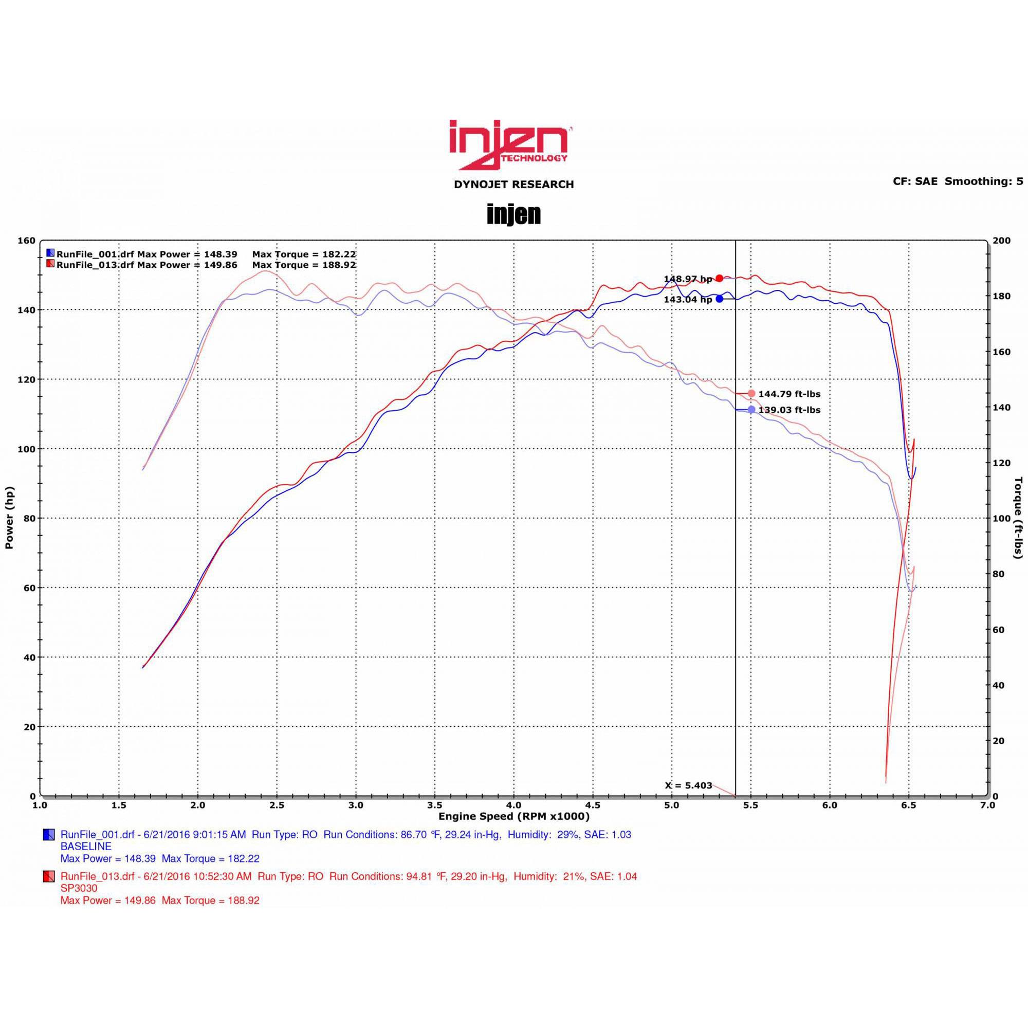 The soul of this intake is found within 6061-T6 aluminum air intake tube that provides a smooth uninterrupted path for highly efficient airflow. Our engineers have painstakingly designed the intake to provide the highest levels of safe power, along with clean aesthetics that will impress every time you open your hood. In addition to the impressive power increase, the Injen team has ensured that a safe Air fuel (A/F) ratio has been maintained throughout the power band.