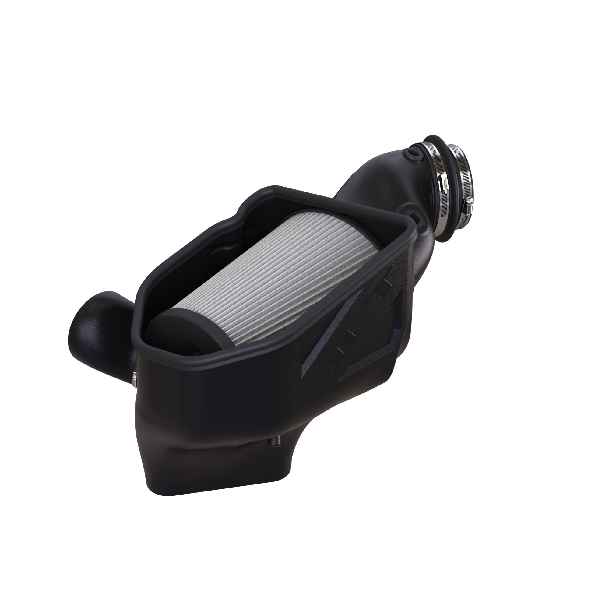 The huge air filter and tube produce a more aggressive sound than stock, with a noticeable increase in supercharger whine.