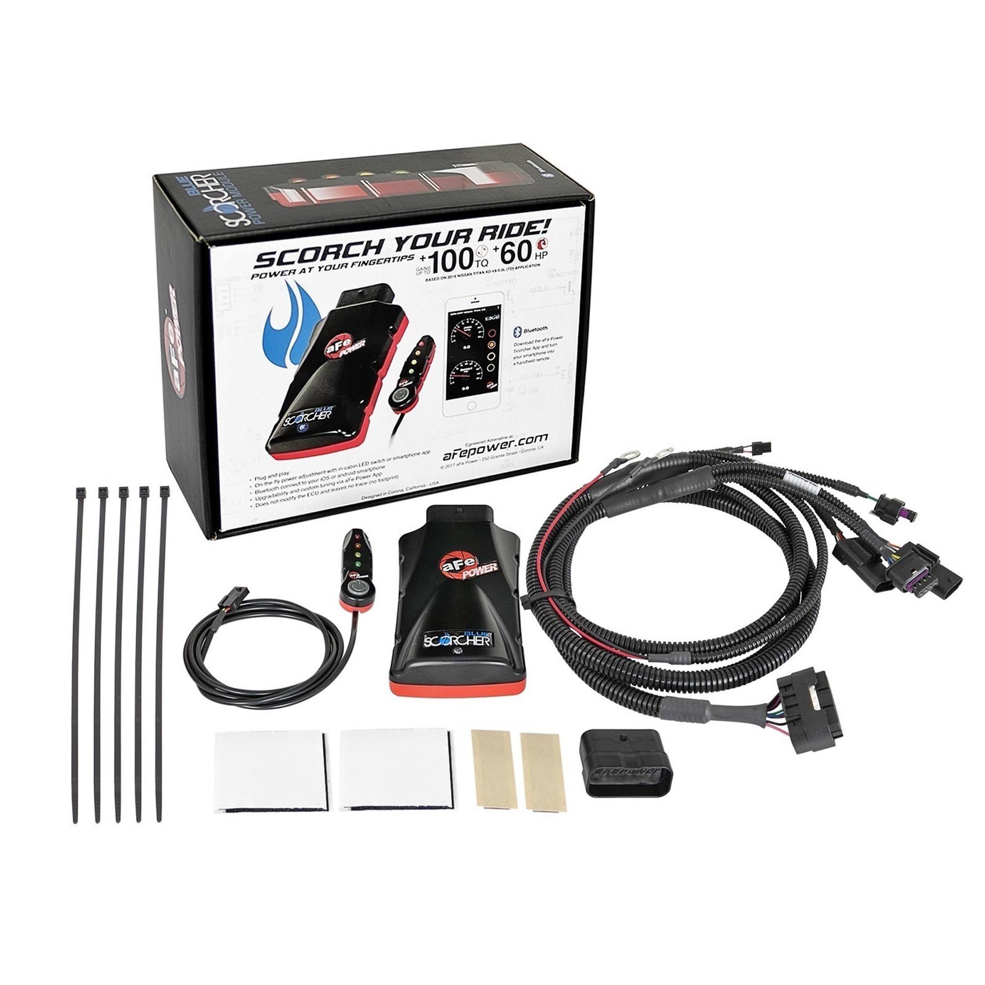 aFe POWER SCORCHER BLUE Power modules are the next generation of plug-and-play electronic module technology. It is the fastest way to safely gain significant horsepower, torque and improve drivability without modifying or leaving any trace on the Engine Control Unit (ECU). The SCORCHER BLUE features an LED control switch for in-cabin, on-the-fly power adjustments with different preset modes. With Bluetooth connectivity you can tap into your iOS or Android device to make power adjustments, custom tune different power modes, view gauges for engine parameters, upgrade to the latest version, measure acceleration times and more. The app is downloadable for free on the App Store or Google Play store.