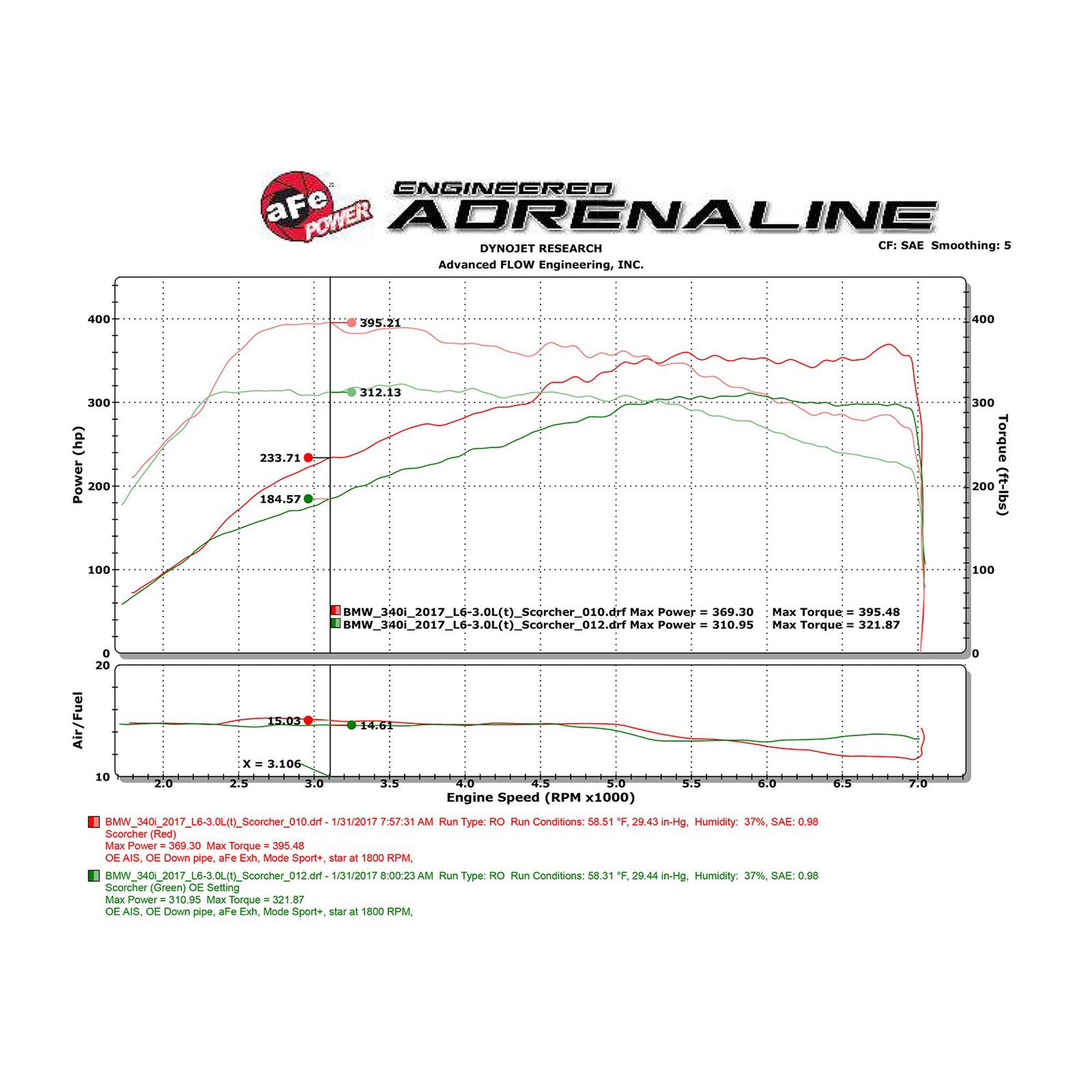 A simple 30 minute install will give you a huge increase in power. The aFe POWER SCORCHER GT Module includes a high quality case & wire harness with factory style connectors for an easy plug & play installation. A LED light switch provides In-Cabin On-The-Fly power adjustments. The 4-Power settings are adjustable with one button and the LED light represent the settings: Stock (Green), Sport (Yellow), Sport+ (Orange) and Race (Red) . This performance module increase turbo boost. It improves vehicle performance and throttle response. In testing, this module resulted in significant +49 horsepower and up to +83 lbs. x ft. of torque verified by our in house dyno.