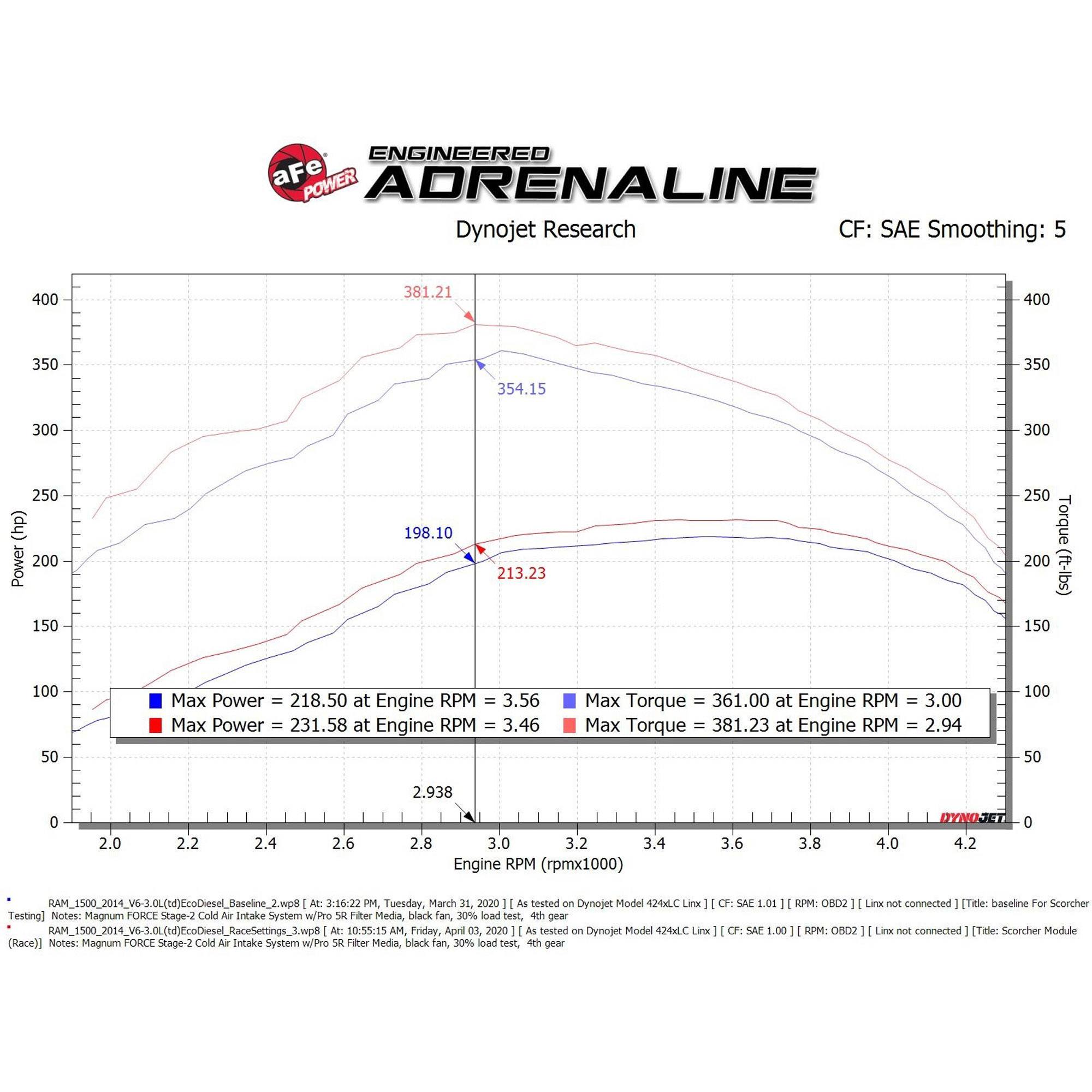 aFe POWER does not recommend to use with any other tuners or modules. aFe POWER recommends to use the SCORCHER HD module in Sport or Sport+ settings during towing. This SCORCHER HD module performs with no issue on truck with or without the EcoDiesel emission re-flash.