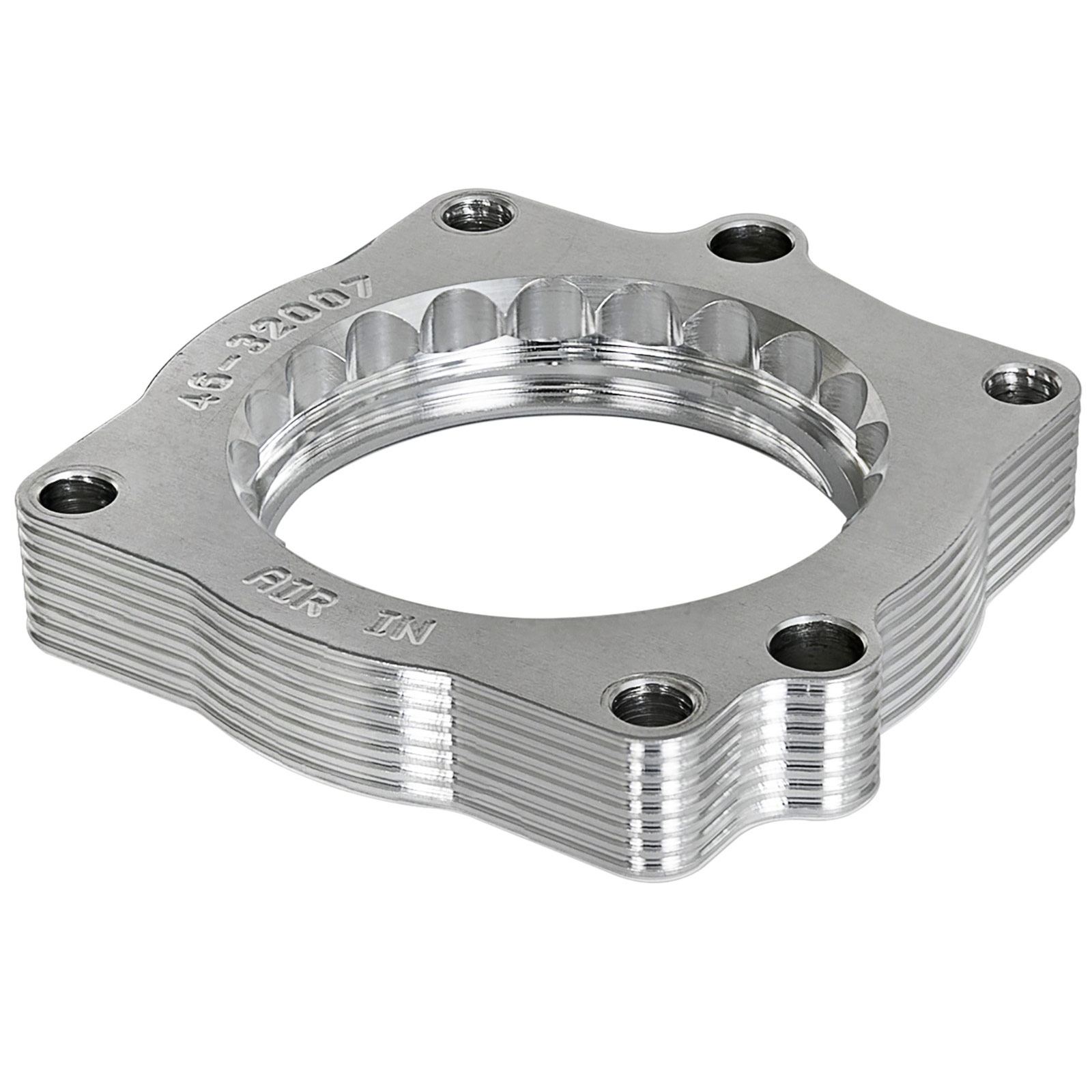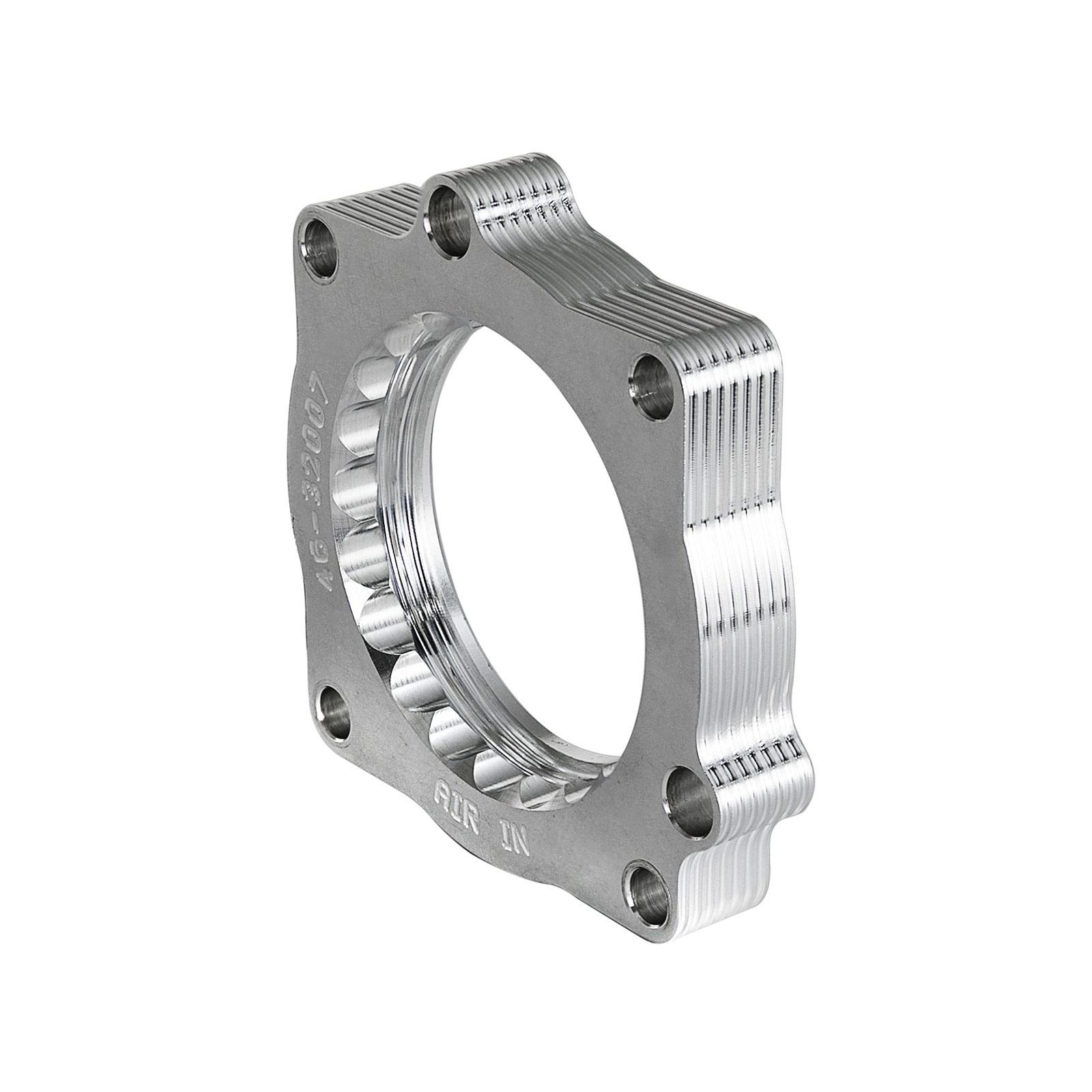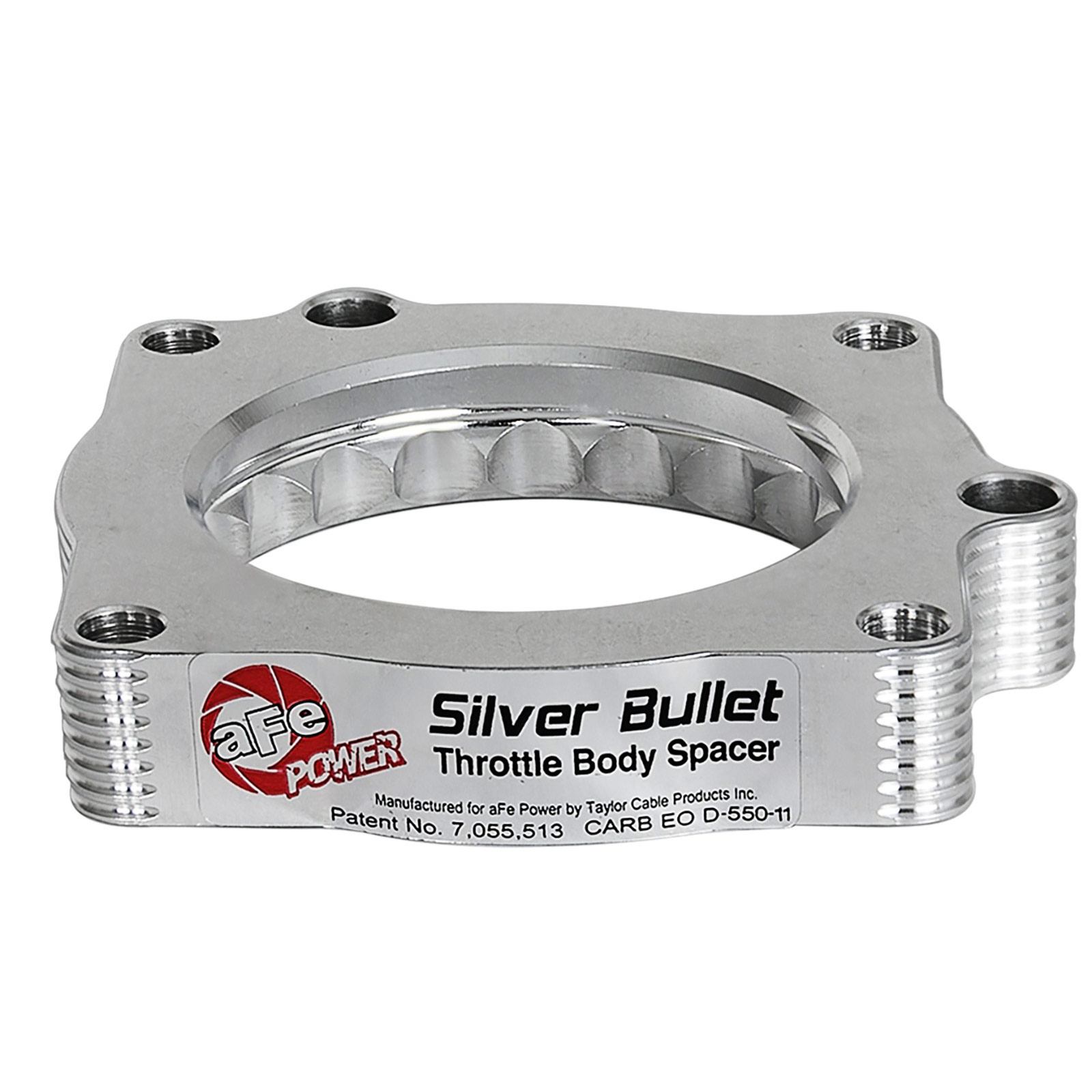 This Silver Bullet throttle body spacer produces up to 12 hp and 14 lbs. x ft. torque and is constructed from precision machined 6061-T6 billet aluminum and is designed using a serrated/helix design that creates turbulence in the air flow at the point just prior entry into the engine optimizing the combustion cycle. This turbulence helps the air/fuel charge burn completely providing increased horsepower, torque and improved throttle response. This spacer works with the OE and aFe POWER cold air intake systems.