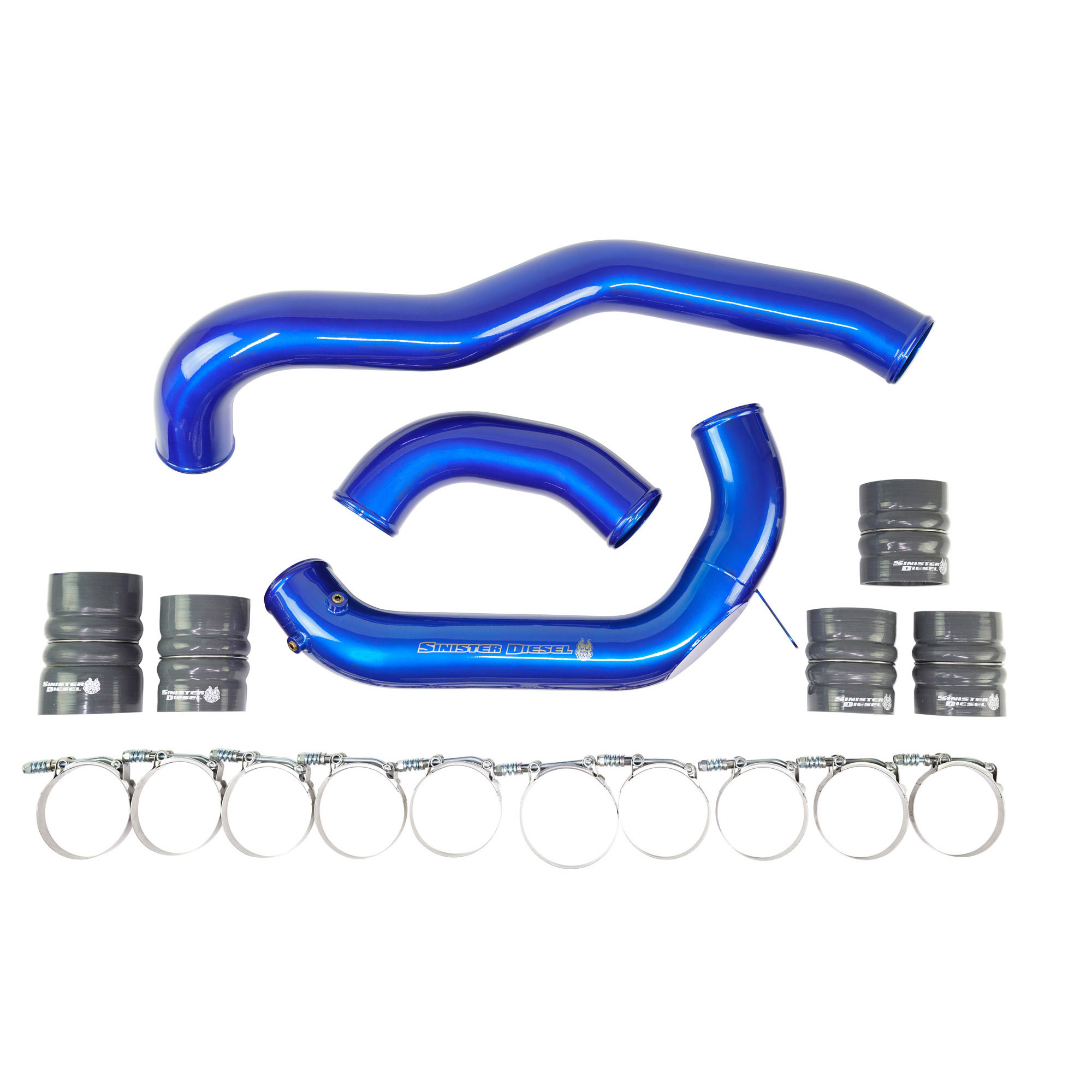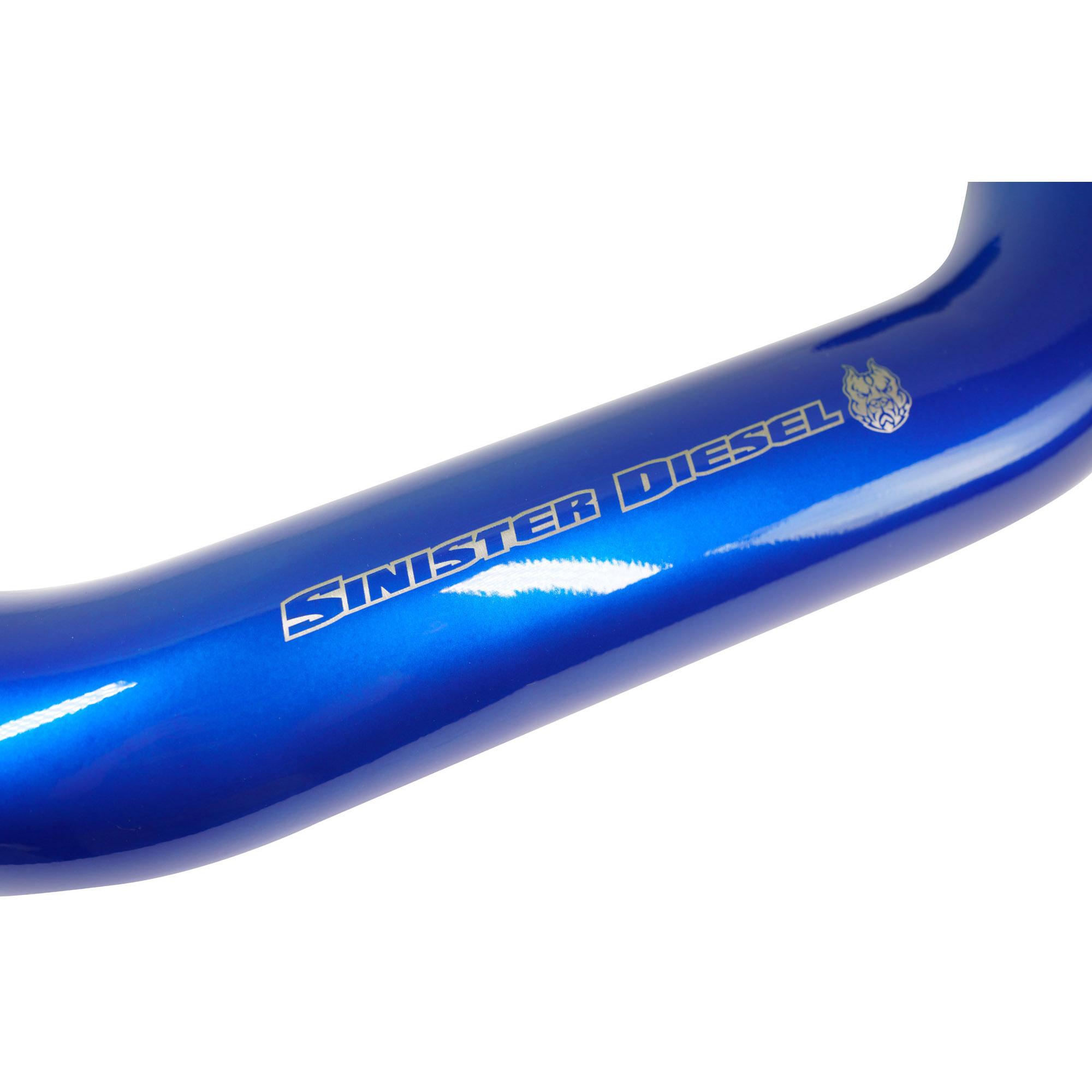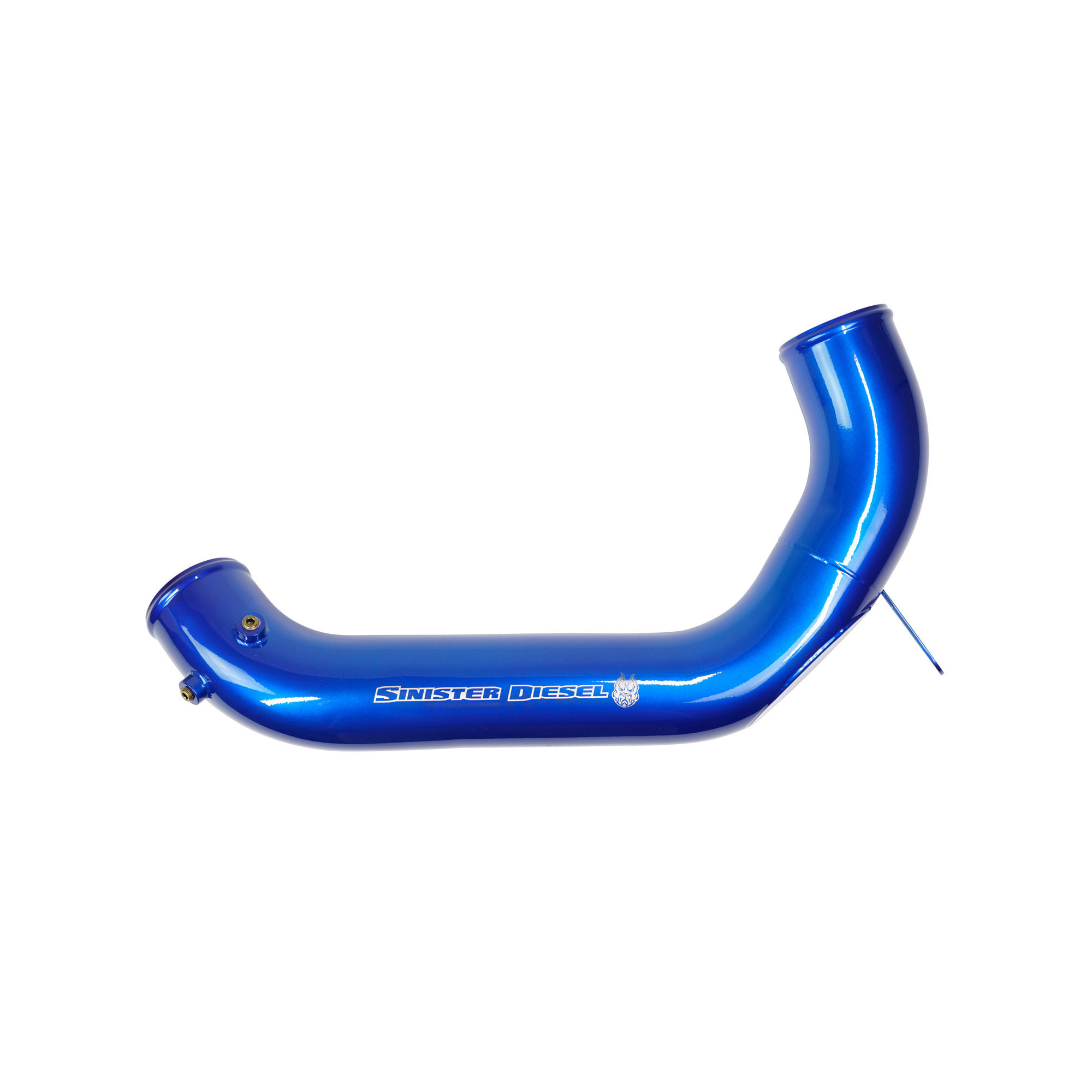 The Sinister Diesel Charge Pipe Kit for the Powerstroke 6.4L includes the intercooler pipe that connects the intercooler to the intake, and the pipe that connects the turbocharger compressor to the intercooler. This upgraded pipe is larger in diameter and has smooth mandrel bends to increase air flow velocity to improve power and lower EGTs. The Sinister Diesel Charge Pipe Kit is also more durable, being made from 6061 Aluminum alloy and connected with Sinister Diesel’s 4-ply silicone boots that are rated up to 400psi. Our Intercooler Pipes are masterfully TIG welded and finished in polished powdercoated Sinister Blue for a beautiful under-hood look.