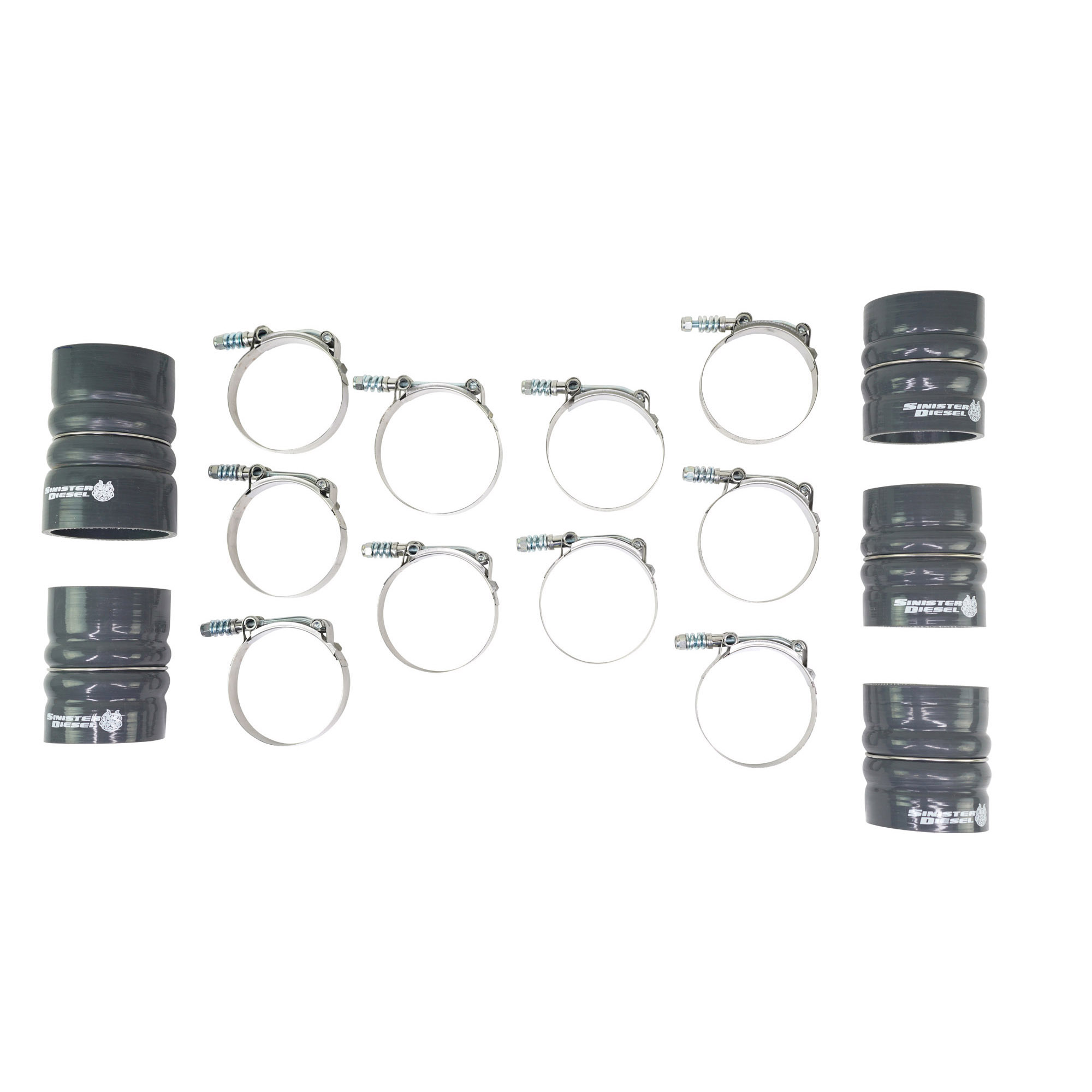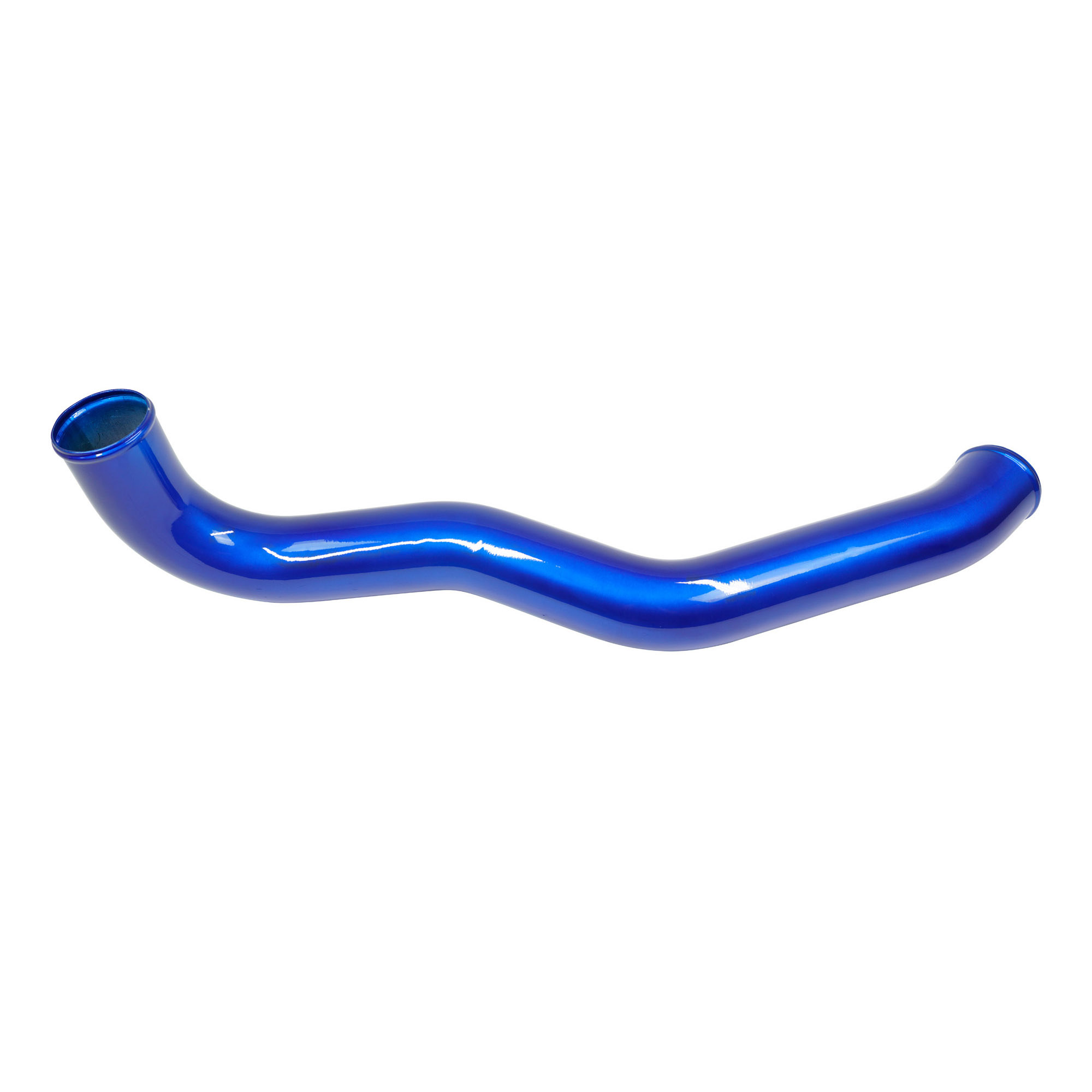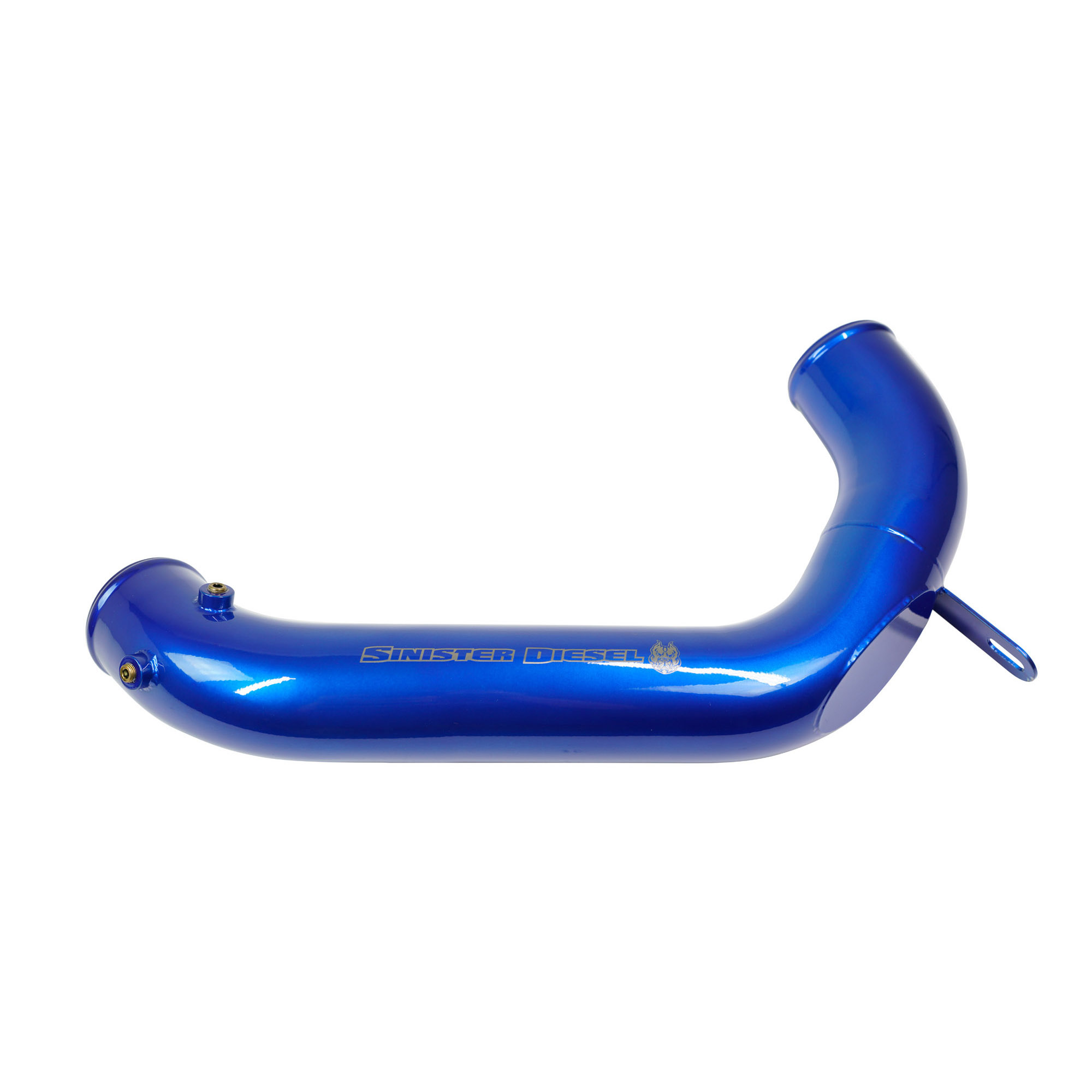The Sinister Diesel Charge Pipe Kit for the Powerstroke 6.4L includes the intercooler pipe that connects the intercooler to the intake, and the pipe that connects the turbocharger compressor to the intercooler. This upgraded pipe is larger in diameter and has smooth mandrel bends to increase air flow velocity to improve power and lower EGTs. The Sinister Diesel Charge Pipe Kit is also more durable, being made from 6061 Aluminum alloy and connected with Sinister Diesel’s 4-ply silicone boots that are rated up to 400psi. Our Intercooler Pipes are masterfully TIG welded and finished in polished powdercoated Sinister Blue for a beautiful under-hood look.
