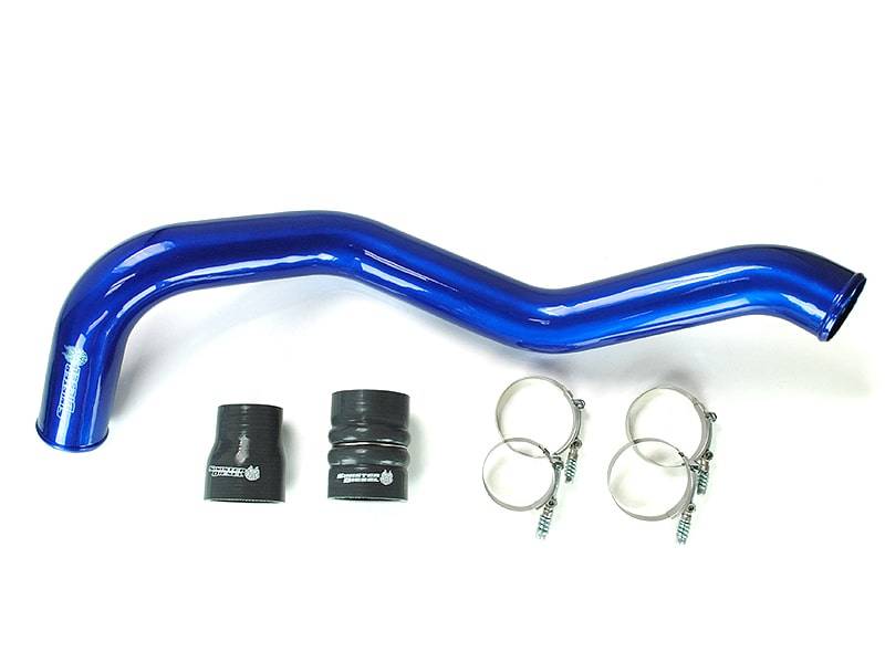 The Sinister Diesel Charge Pipe Kit for the Duramax LMM 6.6L includes the intercooler pipe that connects the turbocharger compressor to the intercooler. This upgraded pipe is larger in diameter and has smooth mandrel bends to increase air flow velocity to improve power and lower EGTs. The Sinister Diesel Charge Pipe Kit is also more durable, being made from 6061 Aluminum alloy and connected with Sinister Diesel’s 4-ply silicone boots that are rated up to 400psi. Our Intercooler Pipes are TIG welded and finished in polished powder-coated Sinister Blue for a beautiful under-hood look.